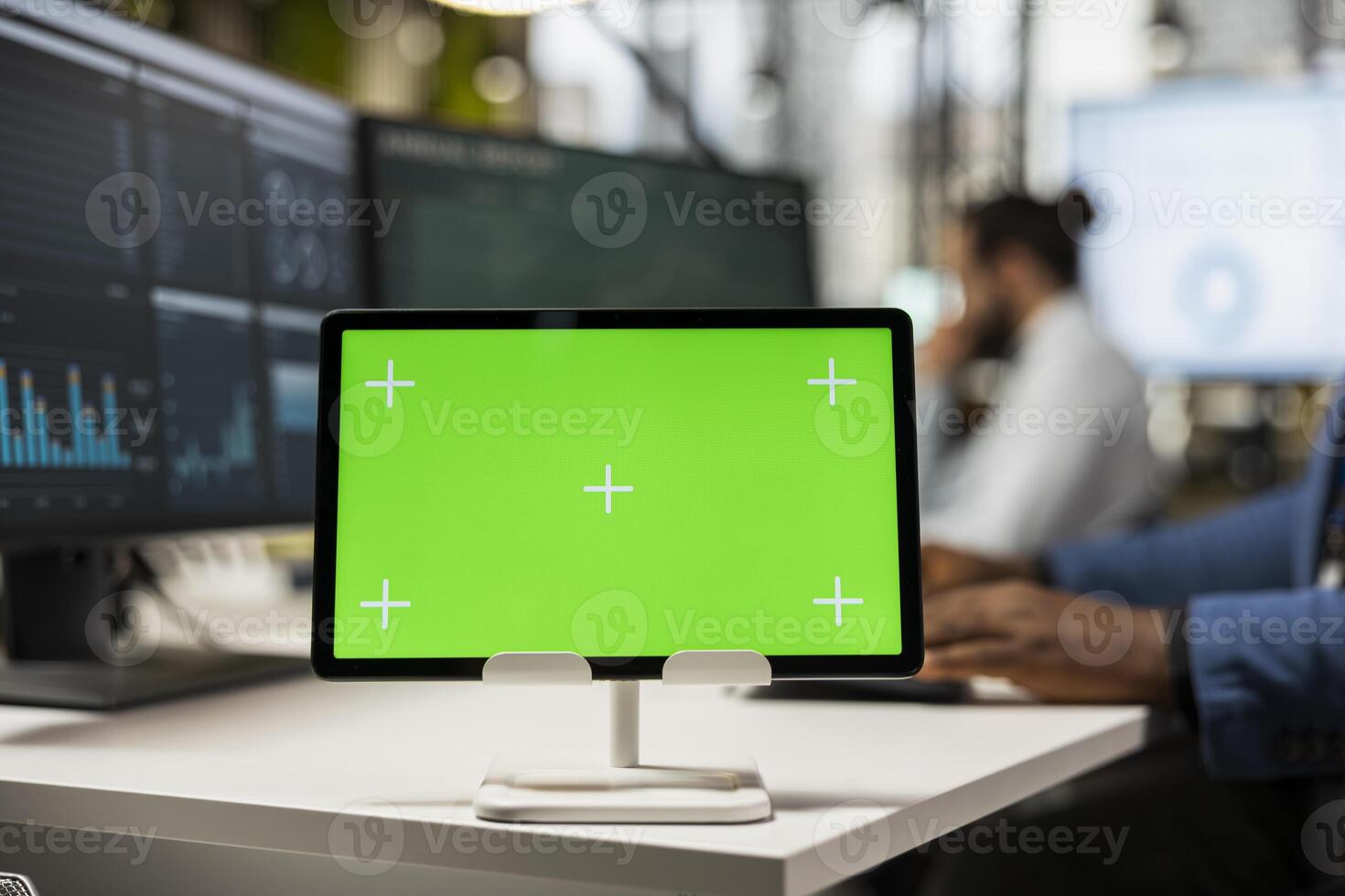 Close up of black businessman examines reports on graphs with chroma key on tablet, building a new business strategy for global development. Objectives alignment with productivity. Pro Photo