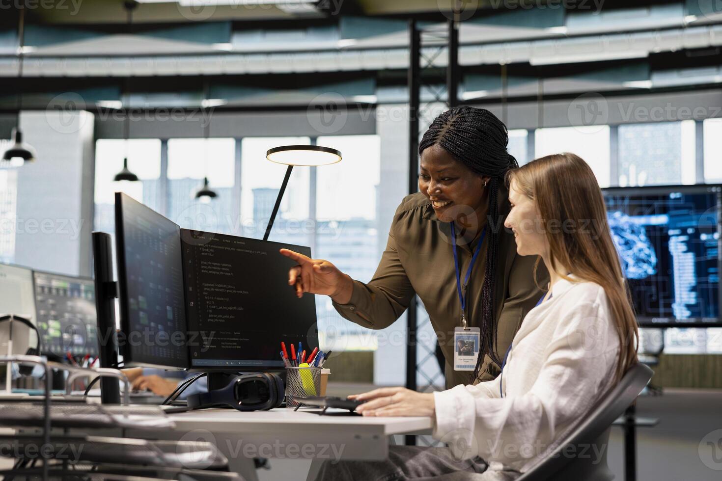 Friendly senior engineer mentoring jolly junior dev at workstation in office, reviewing AI system metrics. Happy african american manager guiding intern through code reviewing using machine learning Pro Photo