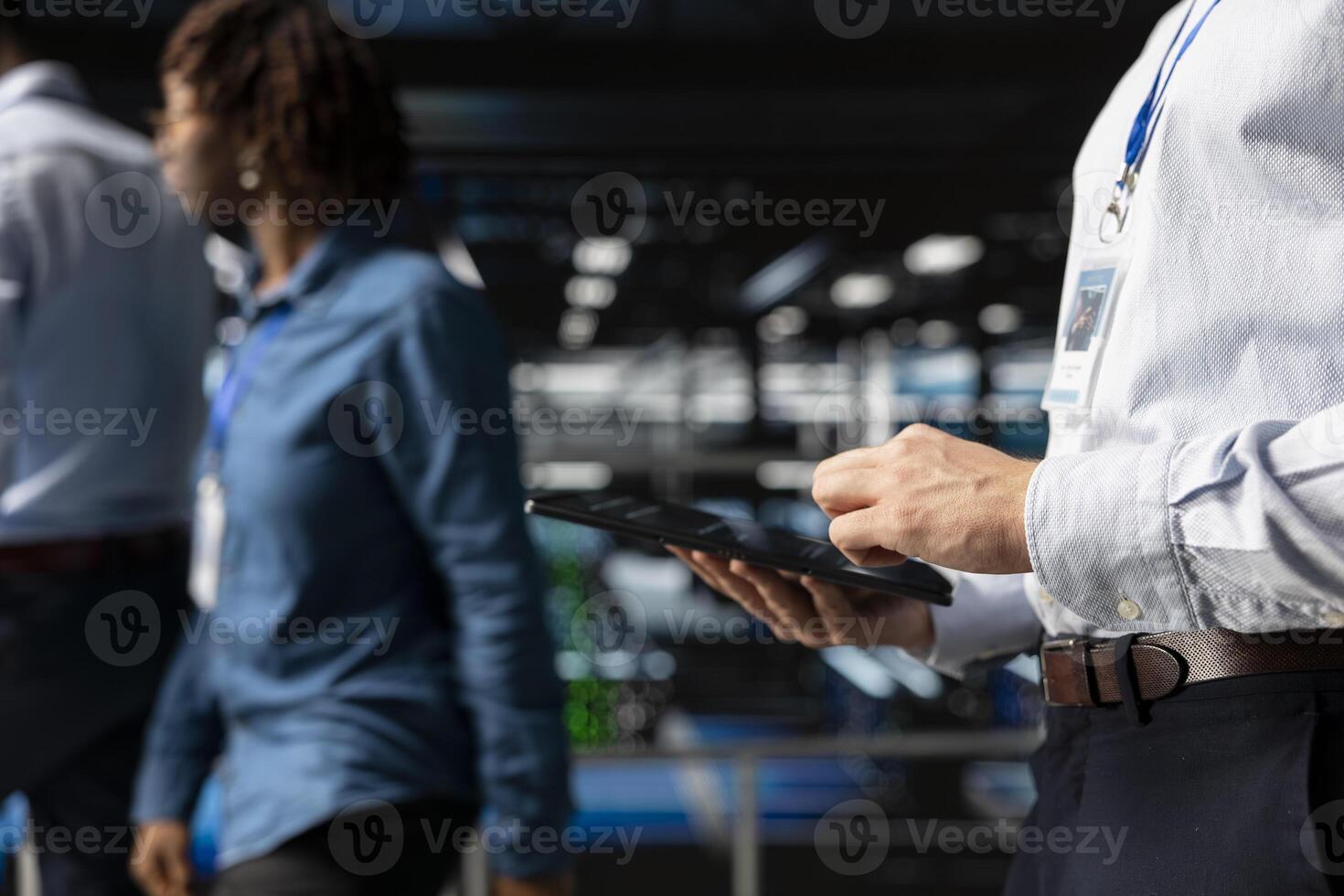 Server farm data scientist using tablet to review AI LLM visualization, intelligent systems for operational stability. Engineer analyzes neural network outputs for stable operations. Pro Photo