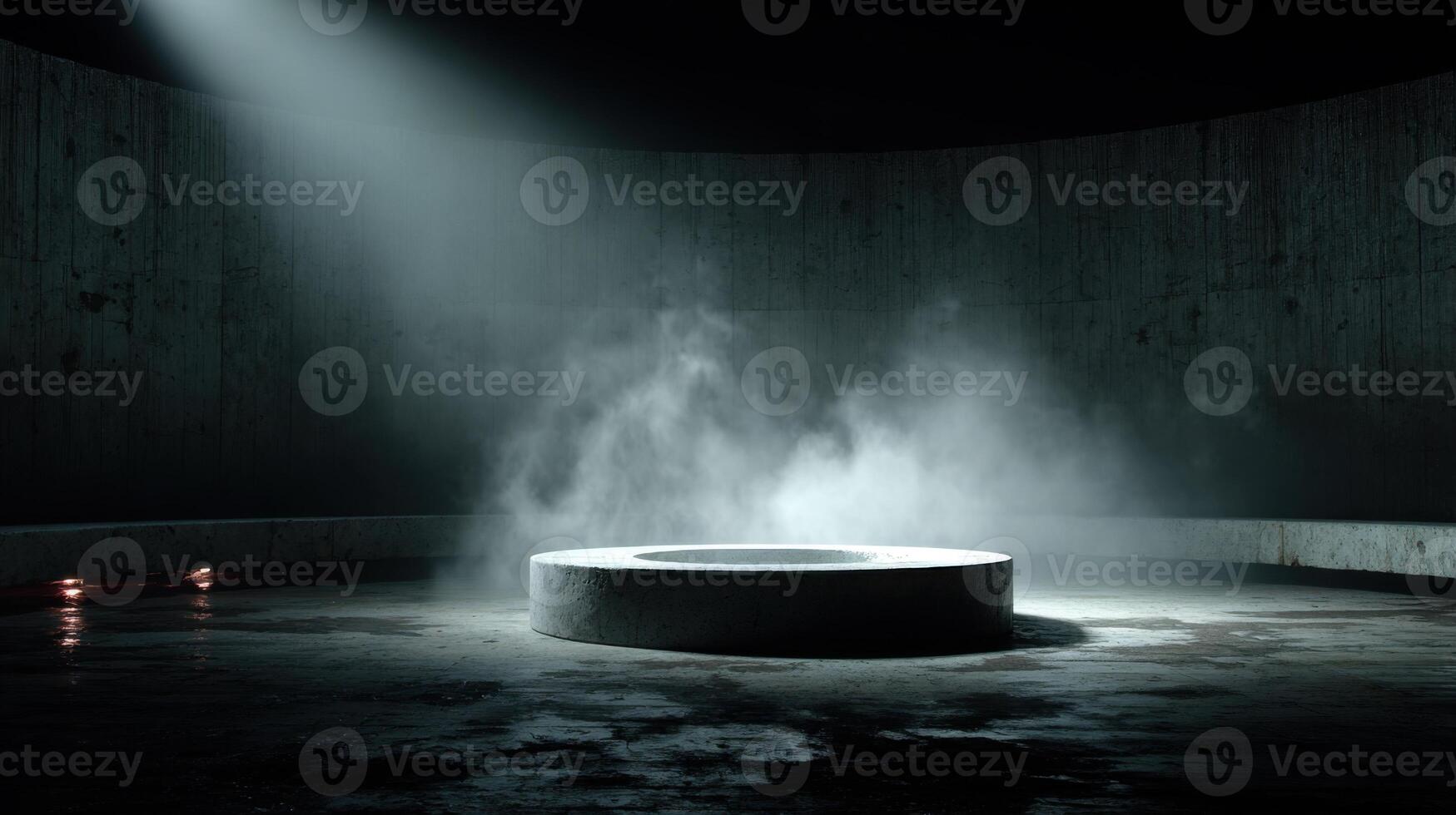 A circular stone platform sits in a dimly lit space, surrounded by walls of concrete. A beam of light shines down, casting shadows while fog swirls around the area, enhancing the enigmatic atmosphere Pro Photo