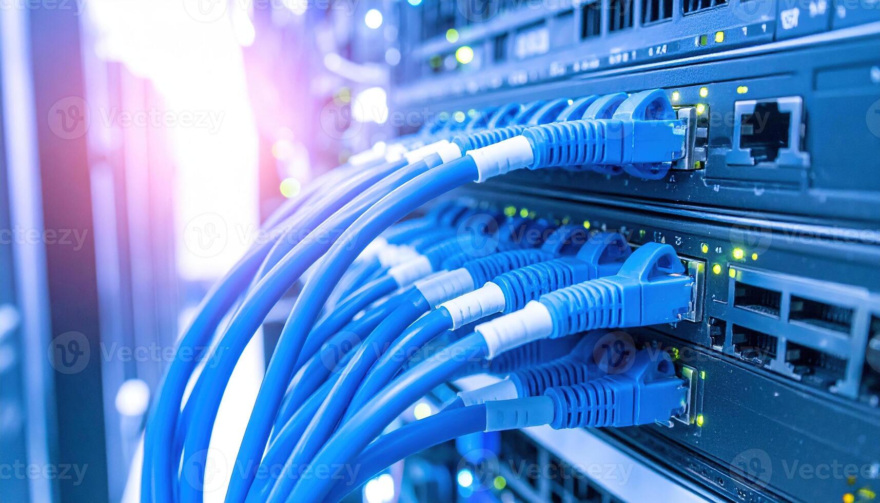 Macro photo of server cables connected in data center, highlighting network infrastructure, IT technology, digital communication, cloud computing, and cybersecurity concept. Pro Photo