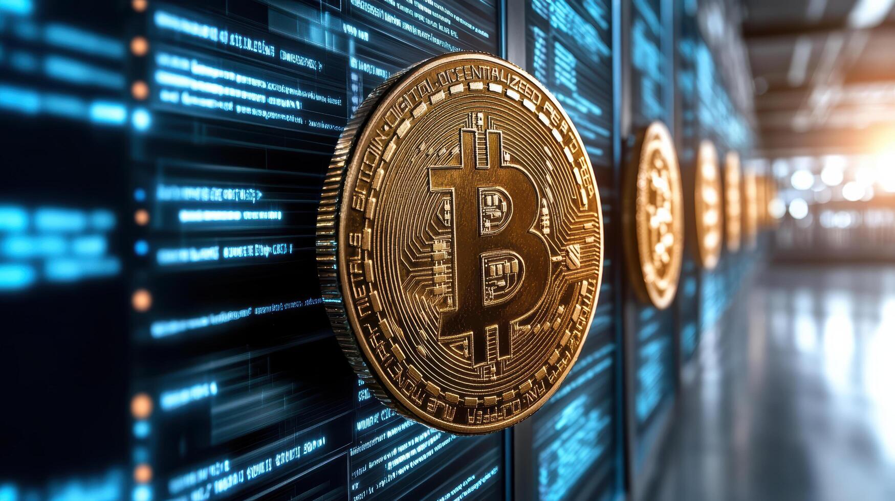 Digital currency symbol shines brightly against backdrop of blockchain data, representing photo