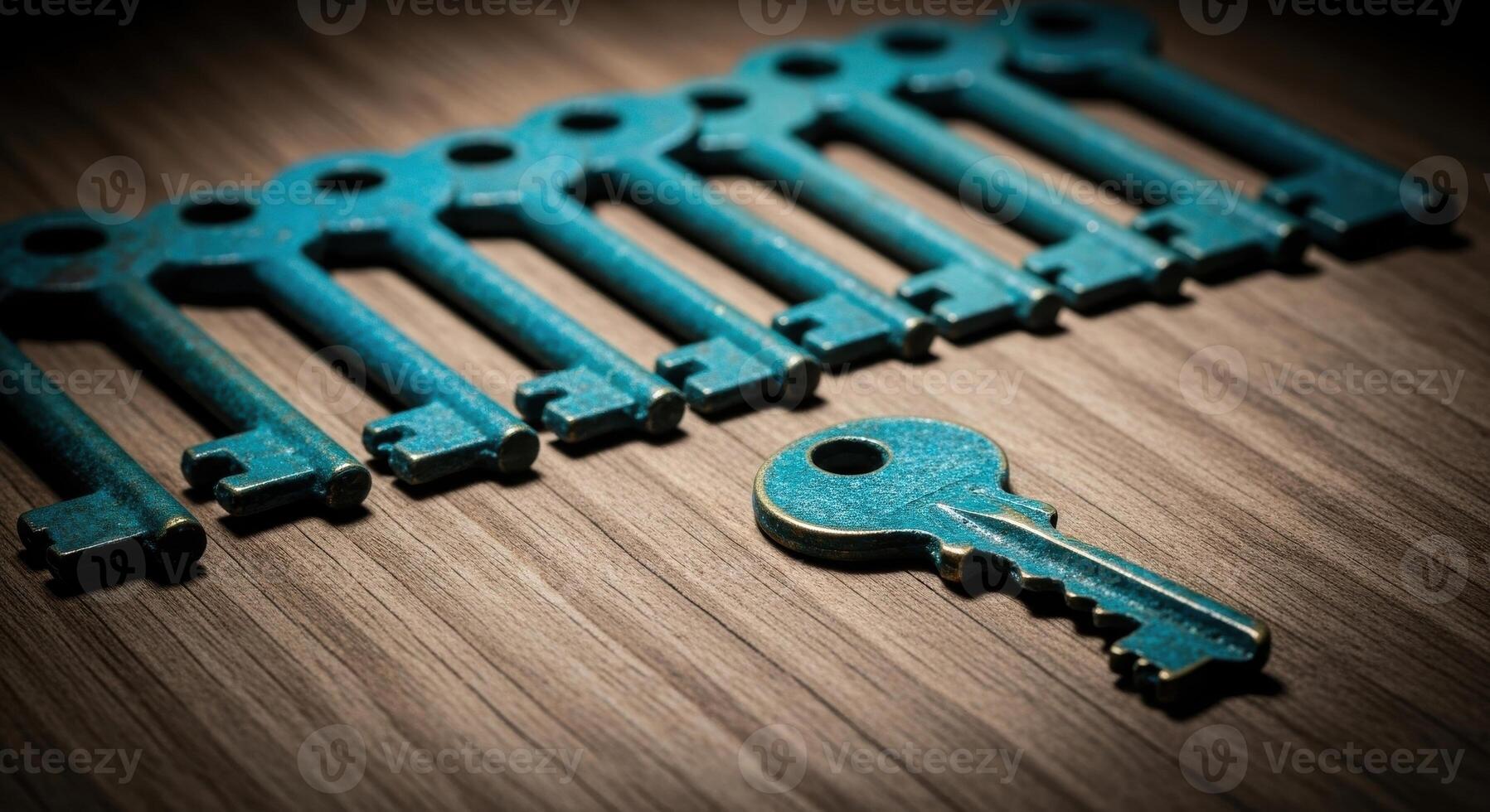 A Single Teal Key with a Verdigris Finish Stands Apart from the Row. Pro Photo