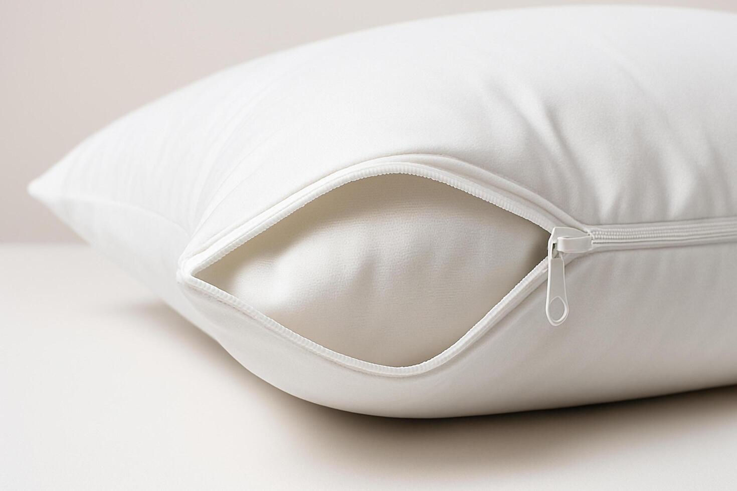 Close-up of a white pillow with a zipper partly open, inner insert visible on a neutral background. Clean minimal product shot. Free Photo