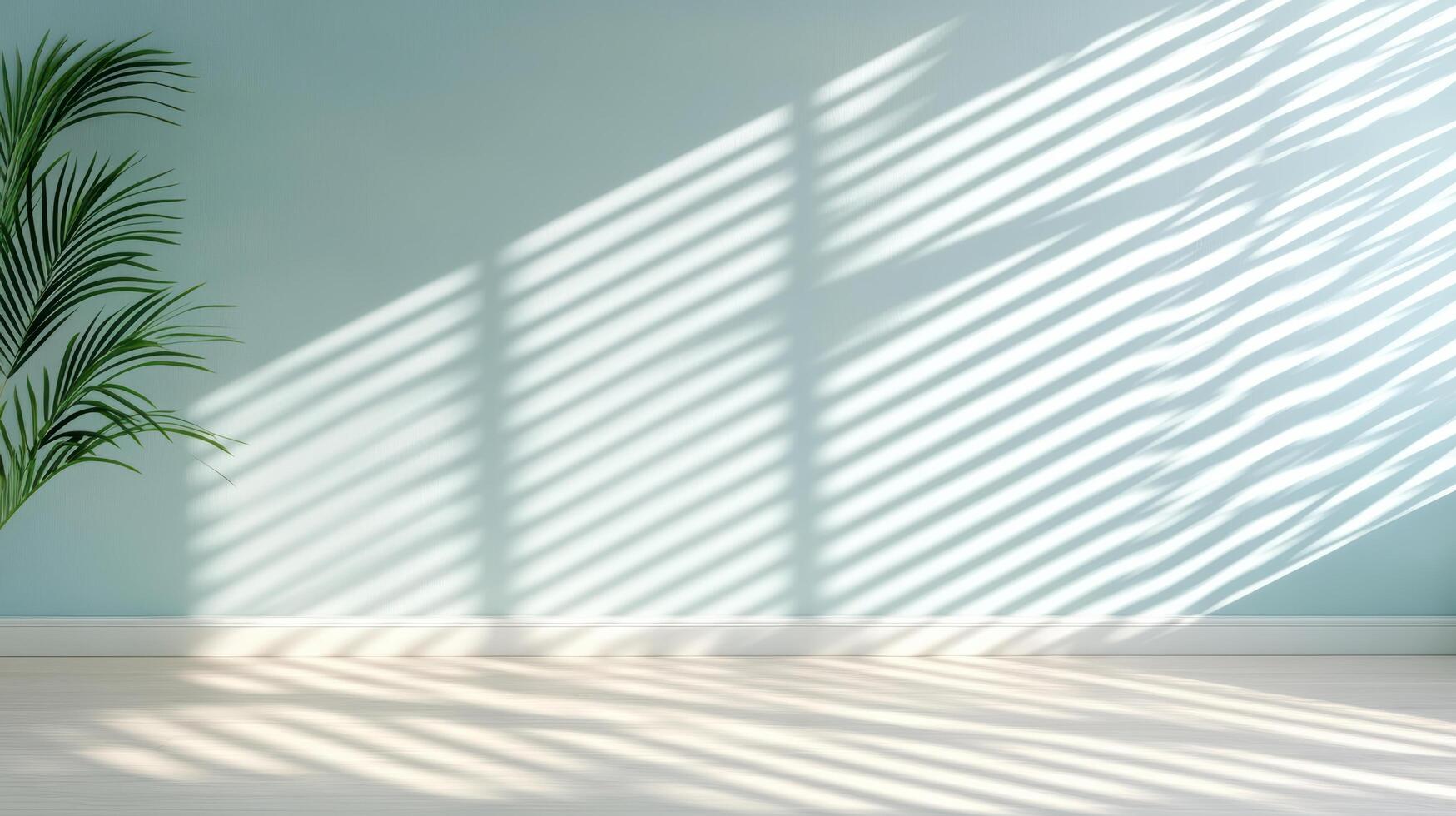 Sharp window blinds casting parallel shadows on light blue wall create serene atmosphere photo