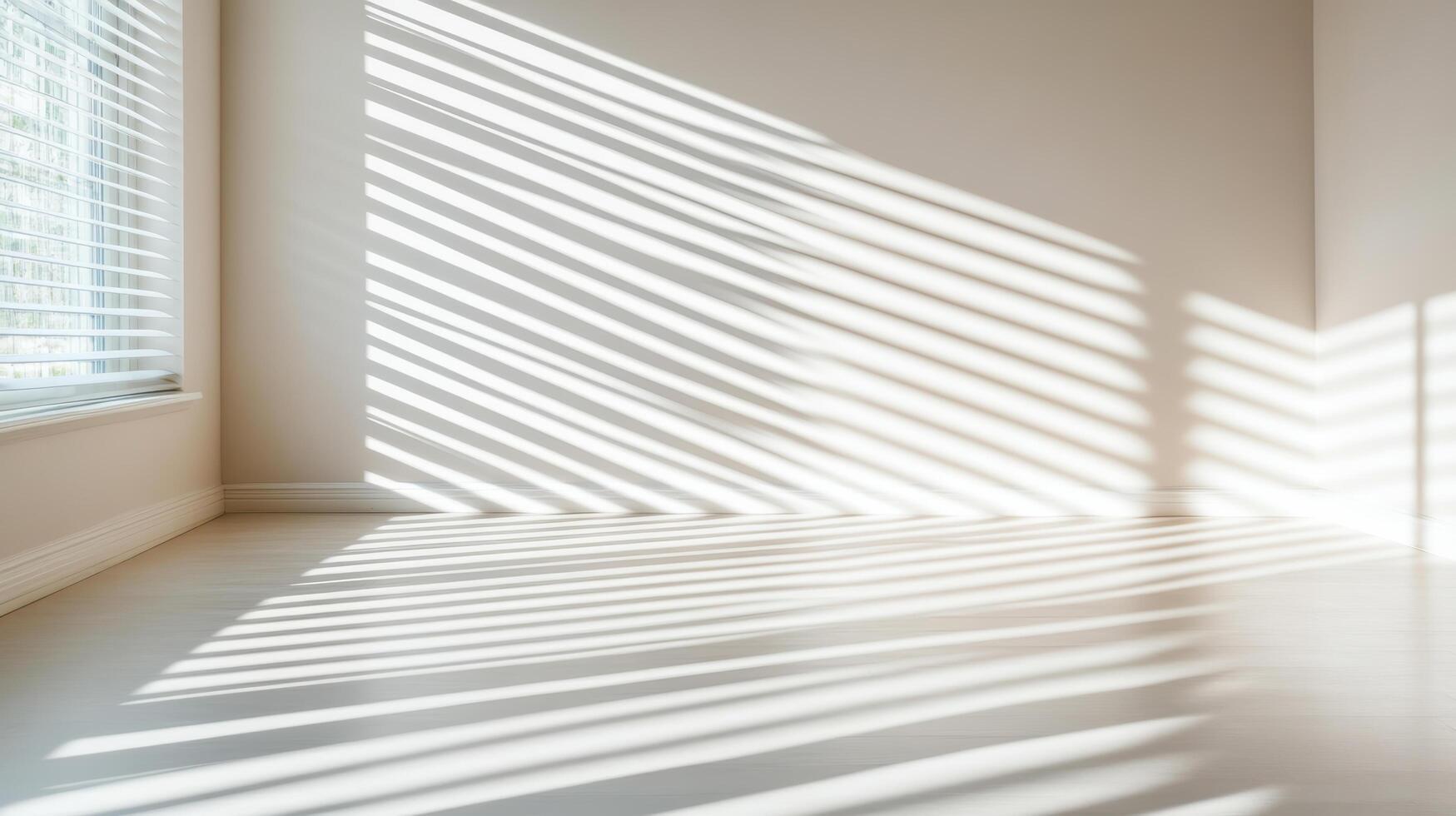 Sharp window blinds casting parallel shadows across minimalist room, creating serene atmosphere photo