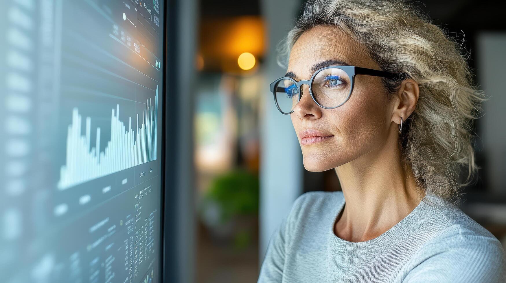 Focused professional analyzing data on screen, showcasing determination and insight photo