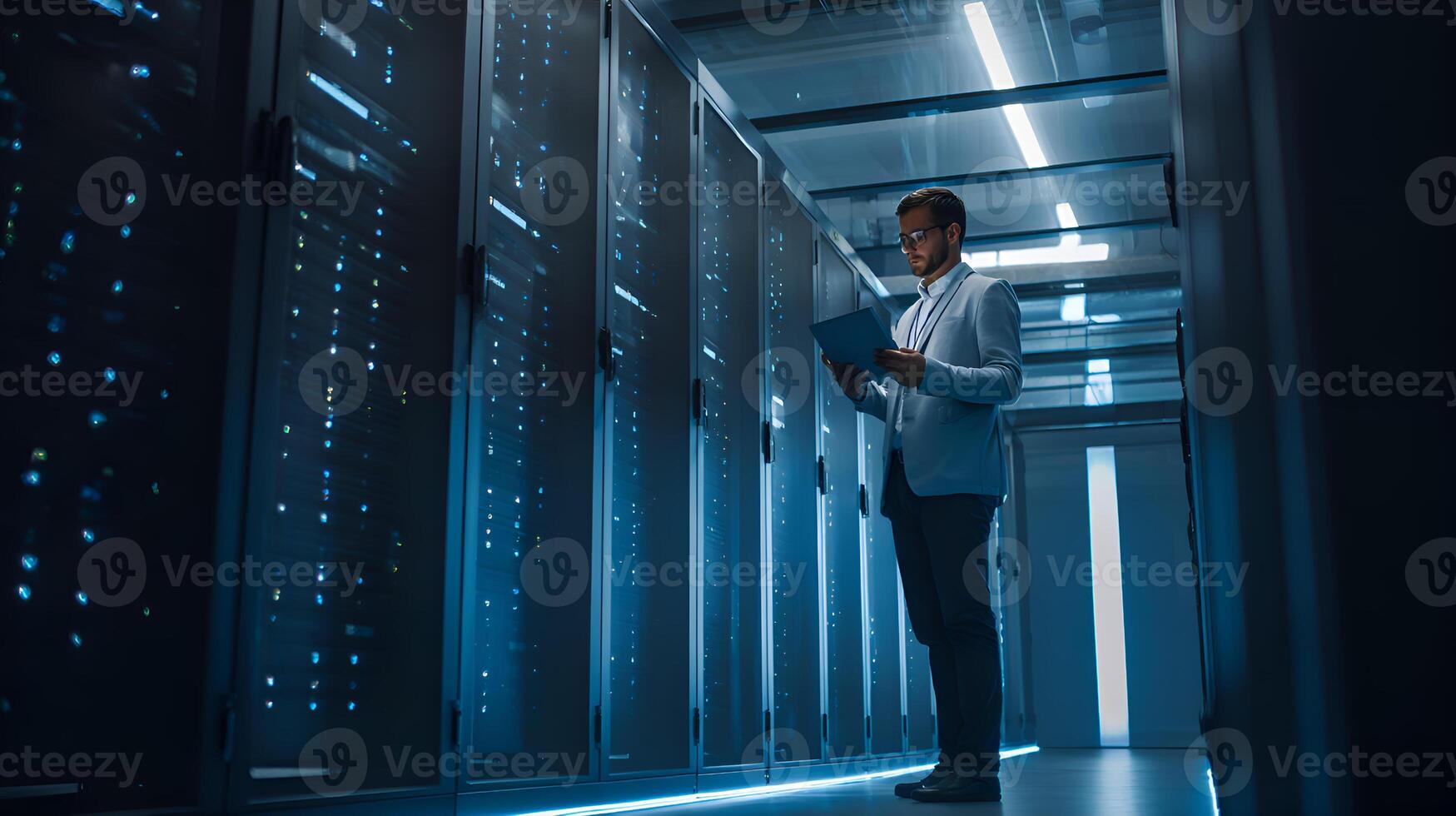 It technician monitoring server rack data using tablet in data center Pro Photo