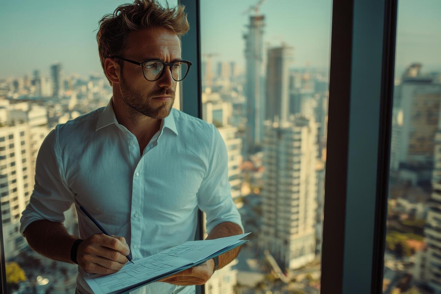 A man in glasses is writing on a notepad while looking out of a window Free Photo