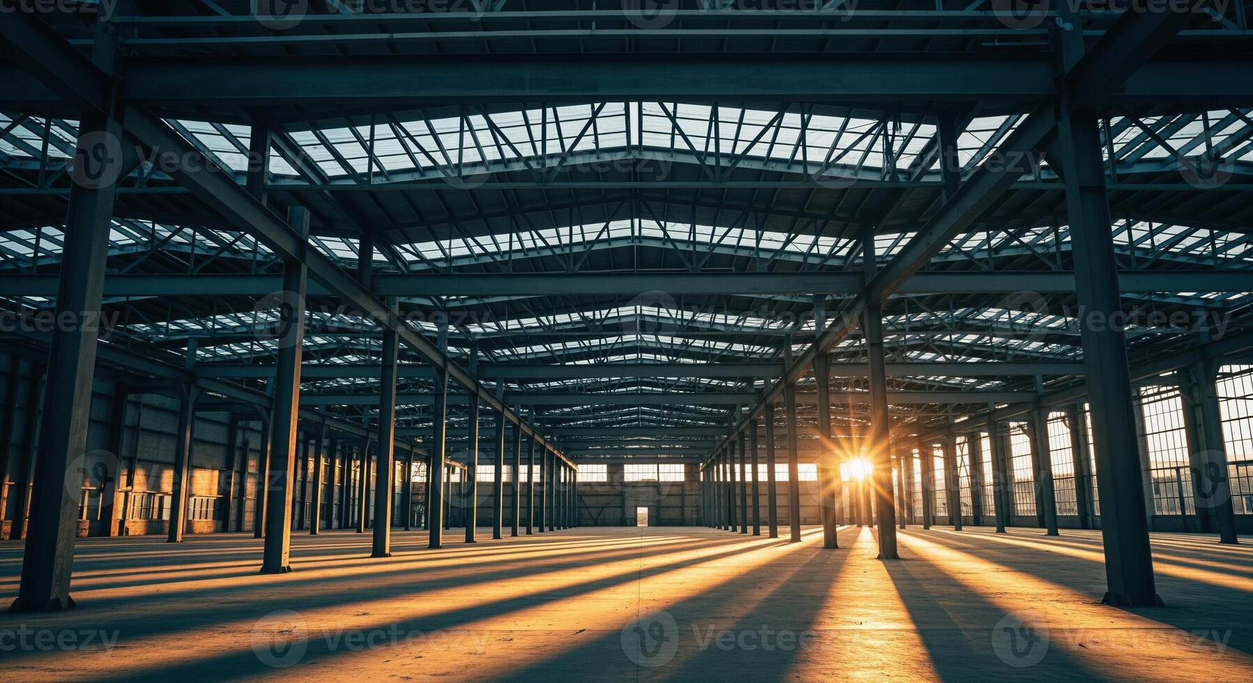 Vast empty industrial building with steel frame structure at sunset creating long shadows Pro Photo