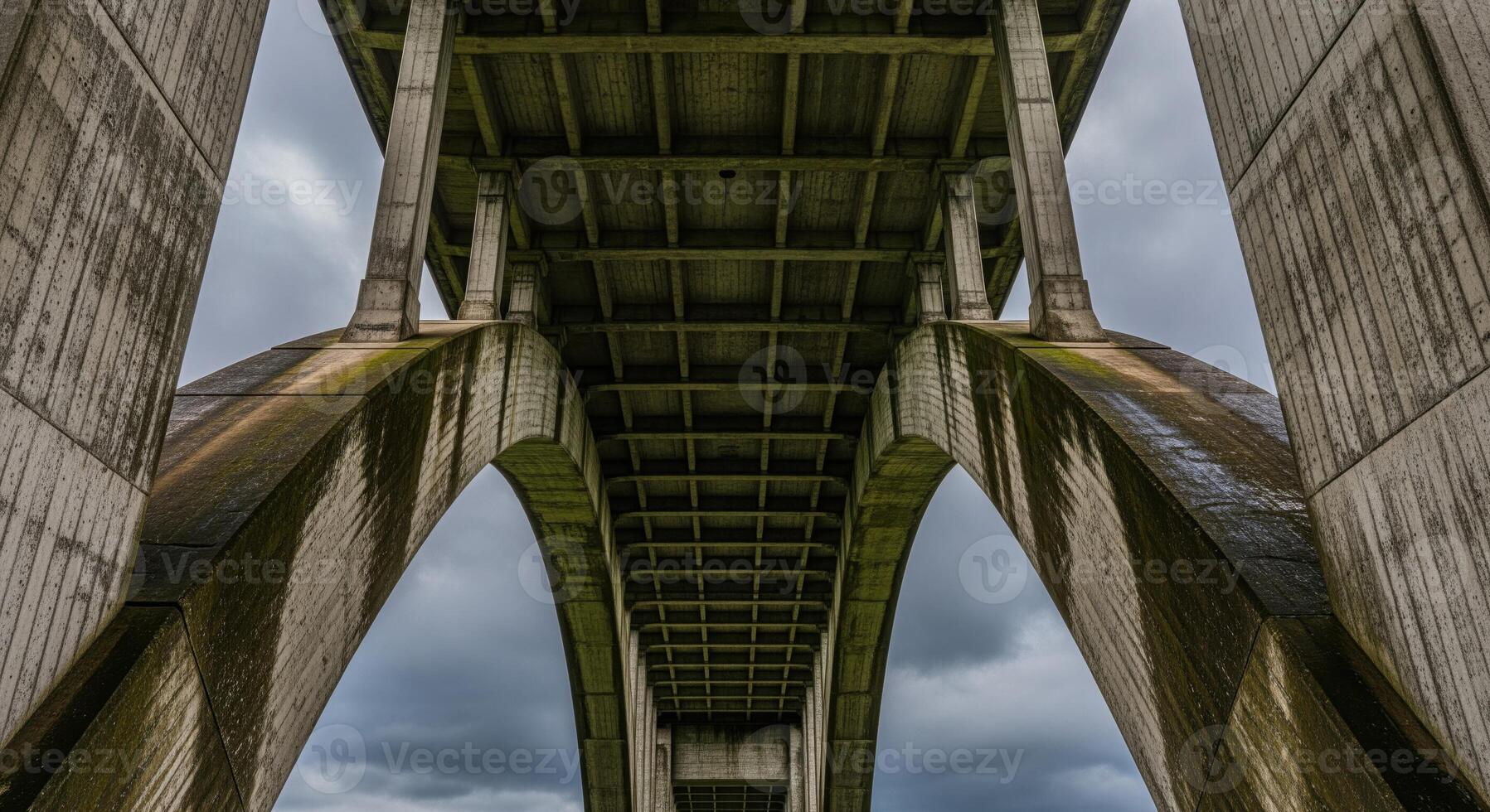 Low angle view of weathered concrete bridge arches and support columns against a cloudy sky Pro Photo