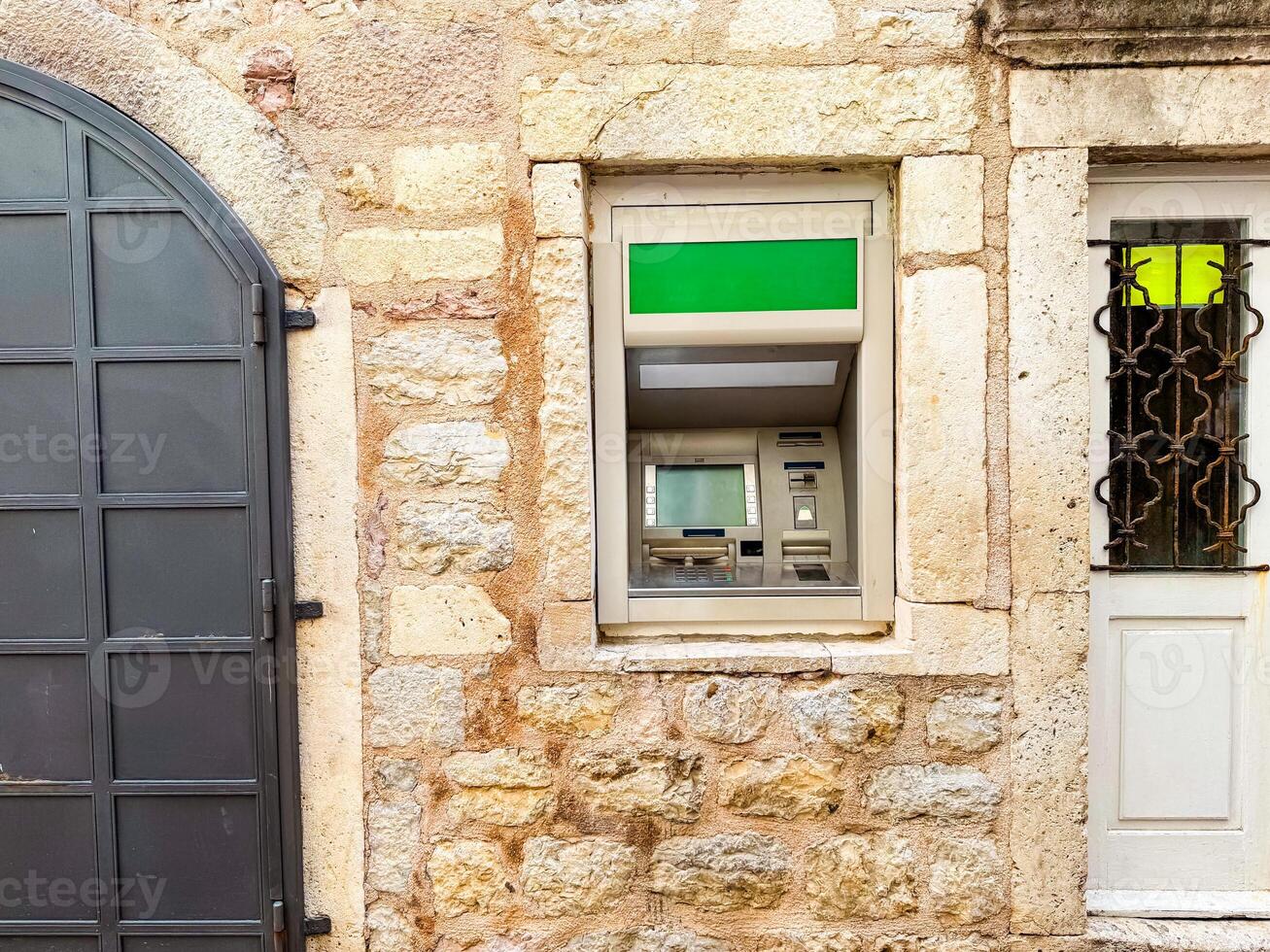 ATM machine installed in a stone building wall with visible access panel. Finance, banking service and secure urban technology system. Pro Photo