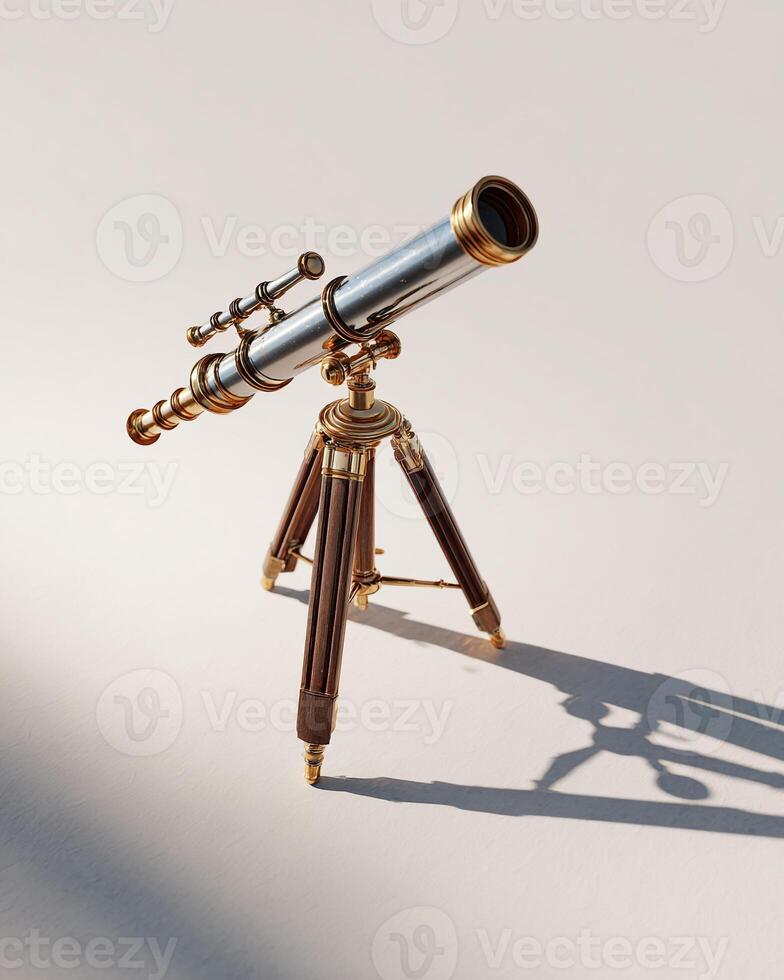 Minimalist flat lay of old telescope on clean bright surface with shadow play representing exploration discovery and navigation hyper realistic Pro Photo
