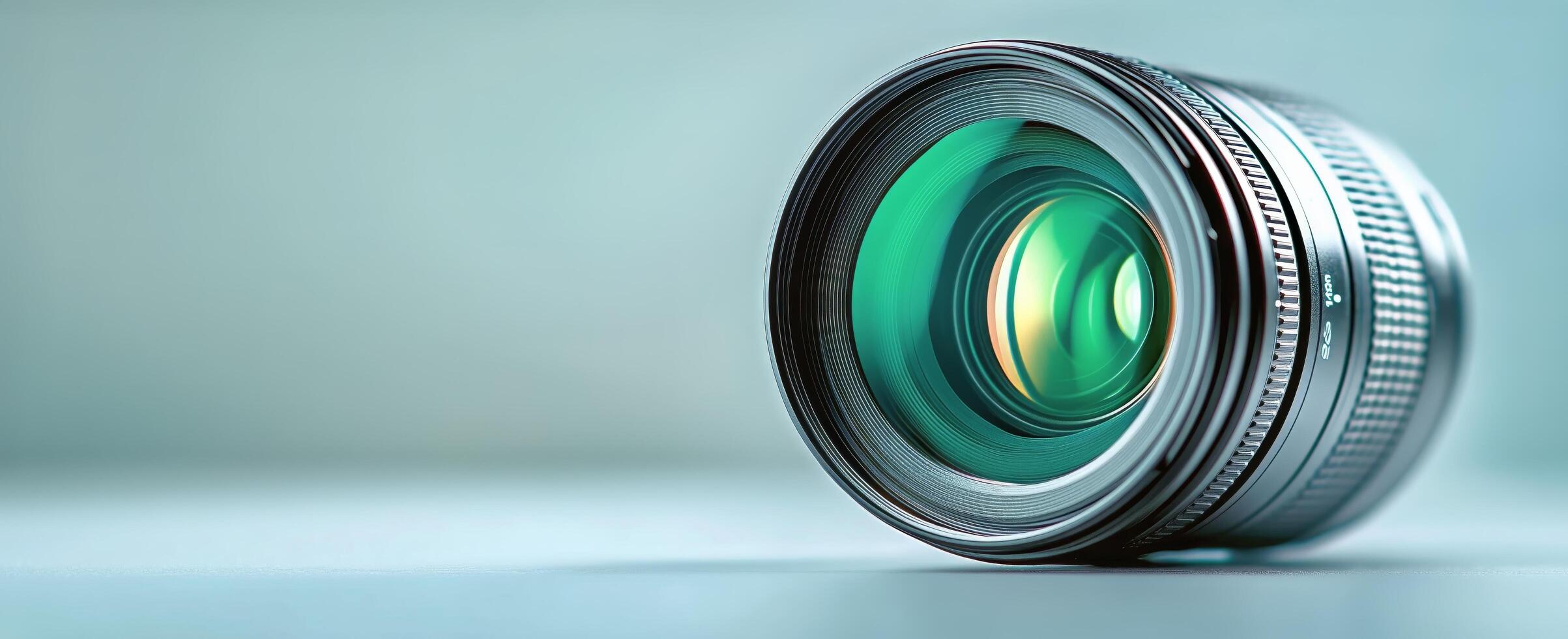 Camera Lens Resting on White Surface With Green Tint Reflecting Light in Studio Setting Free Photo