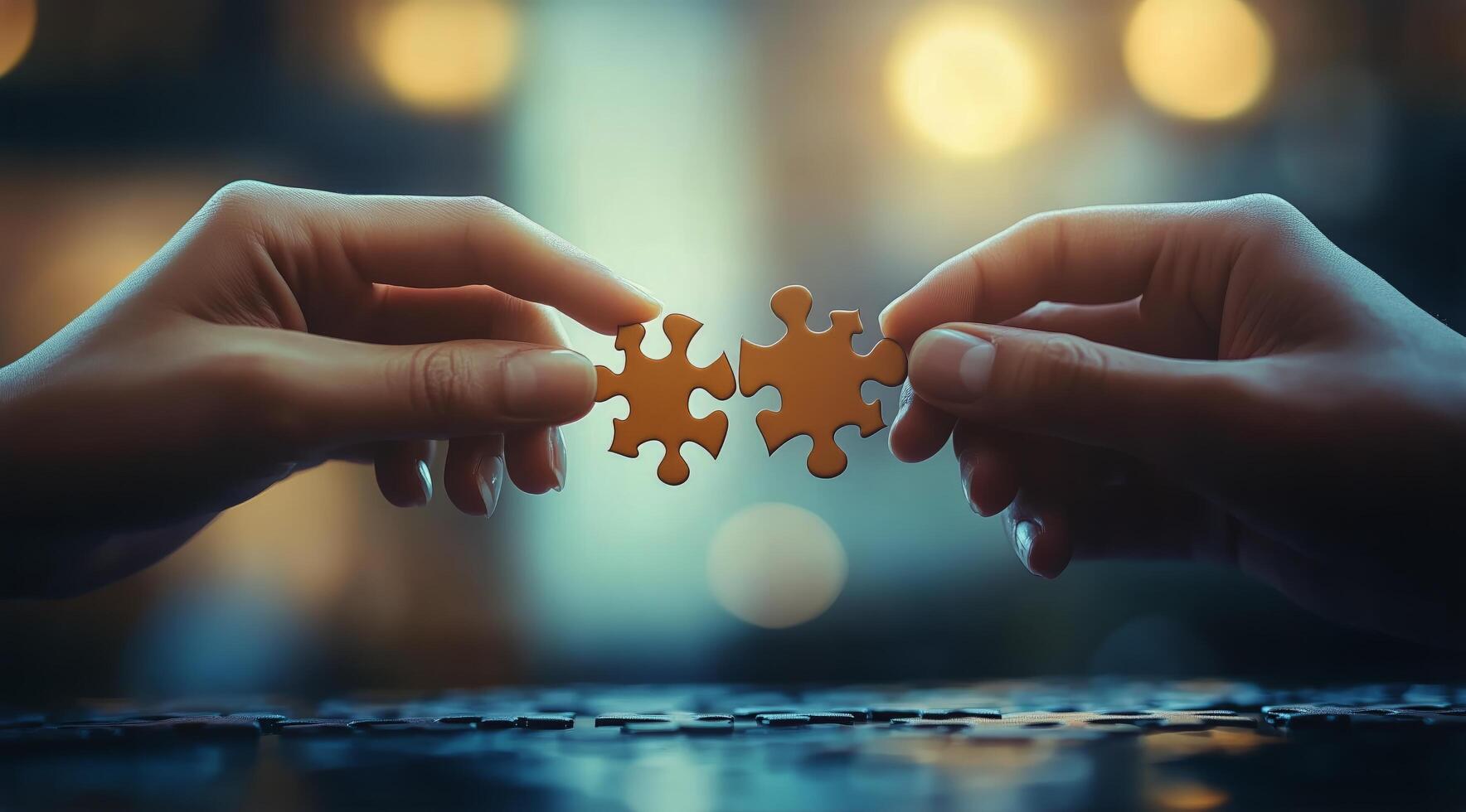 Hands Connect Puzzle Pieces in a Dimly Lit Room Creating a Sense of Unity and Completion photo