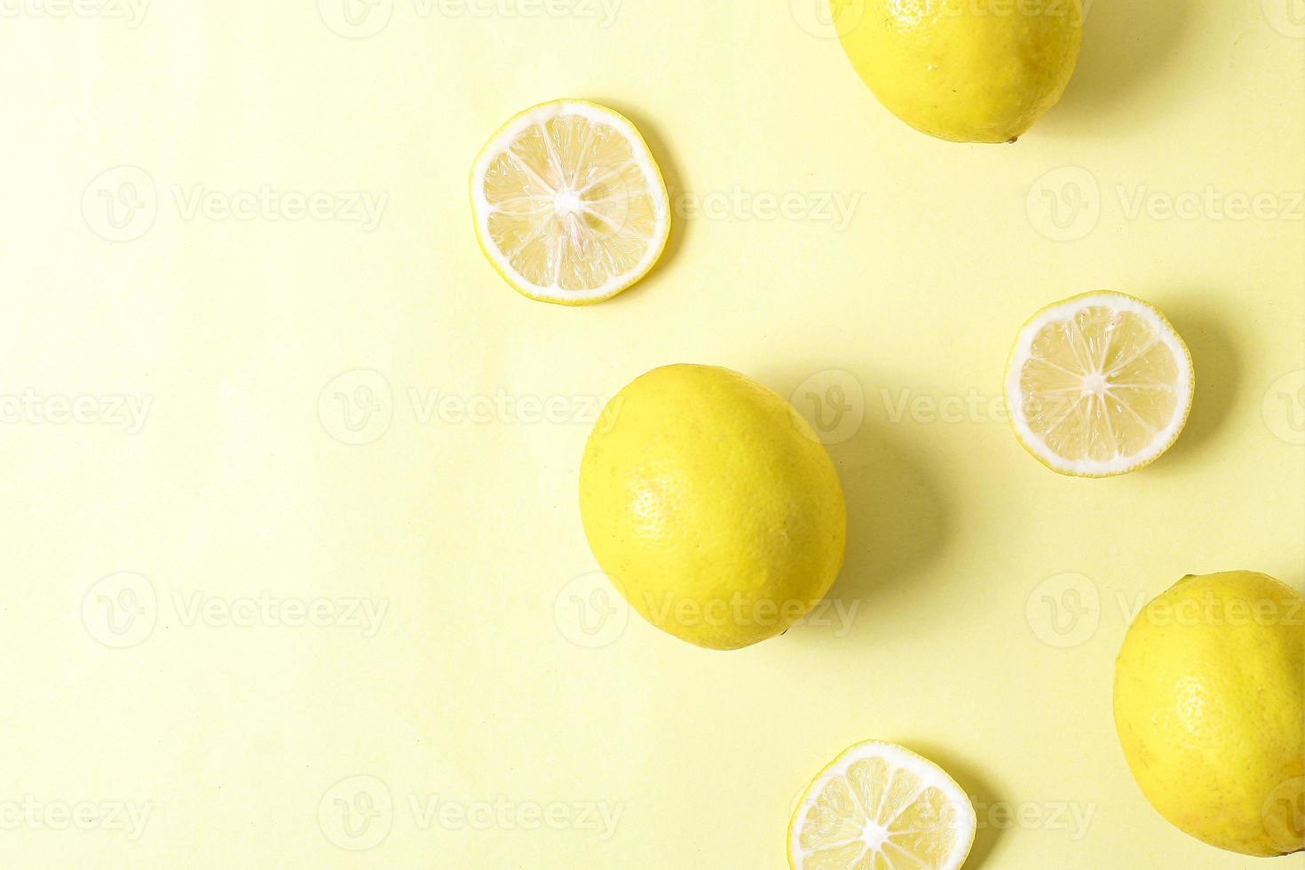 Row of lemon slices texture on yellow background in creative flat lay composition with copy space Pro Photo