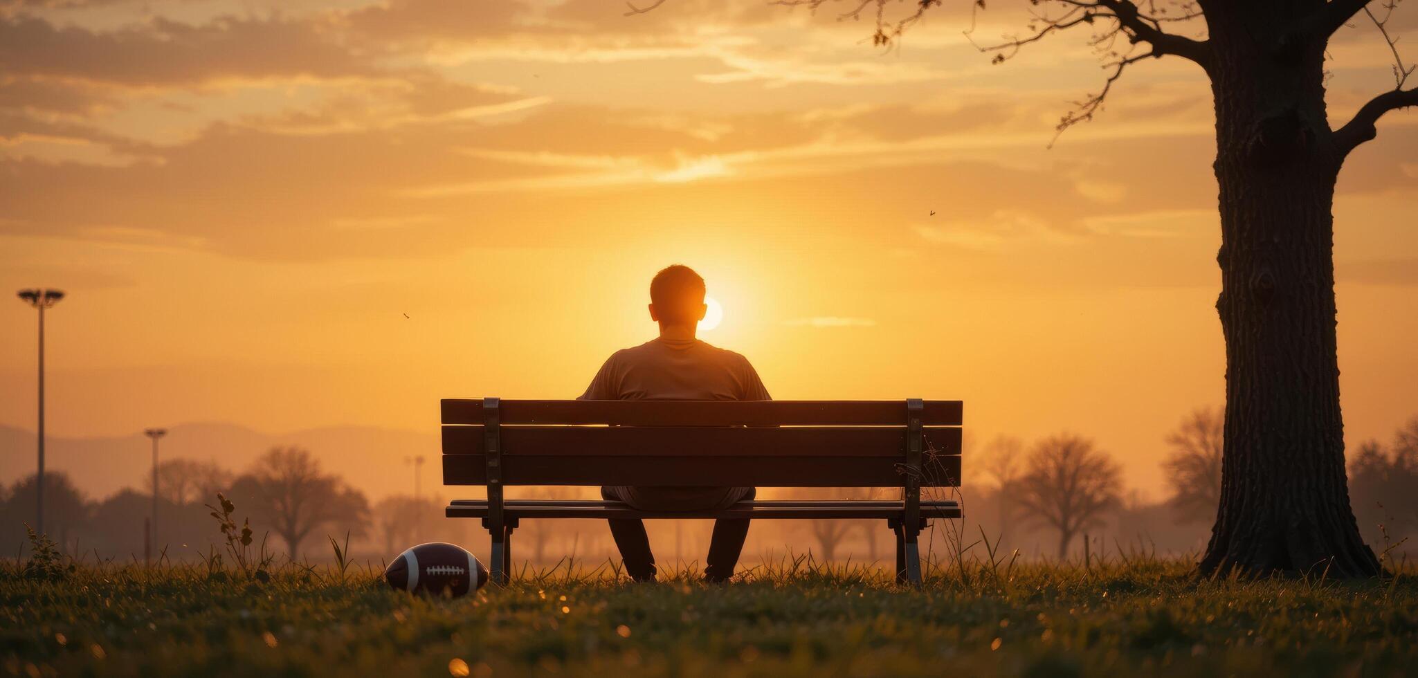 A seated figure looks out at a landscape with an object next to a bench under a tree. Free Photo