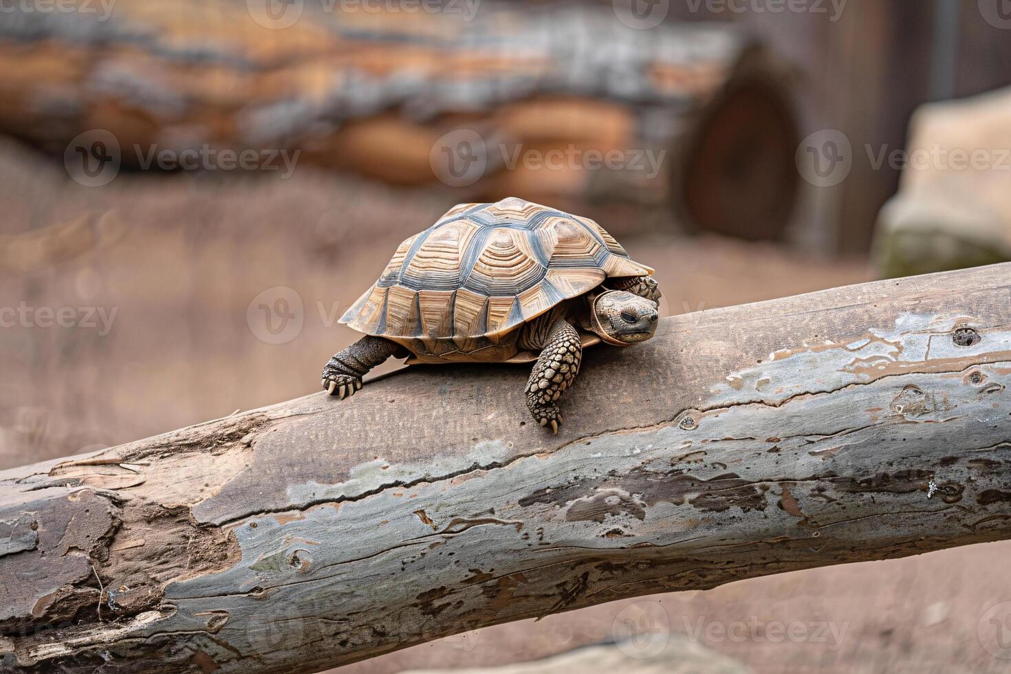 A tortoise gracefully climbs a weathered log in a serene setting, showcasing its unique shell patterns. Pro Photo