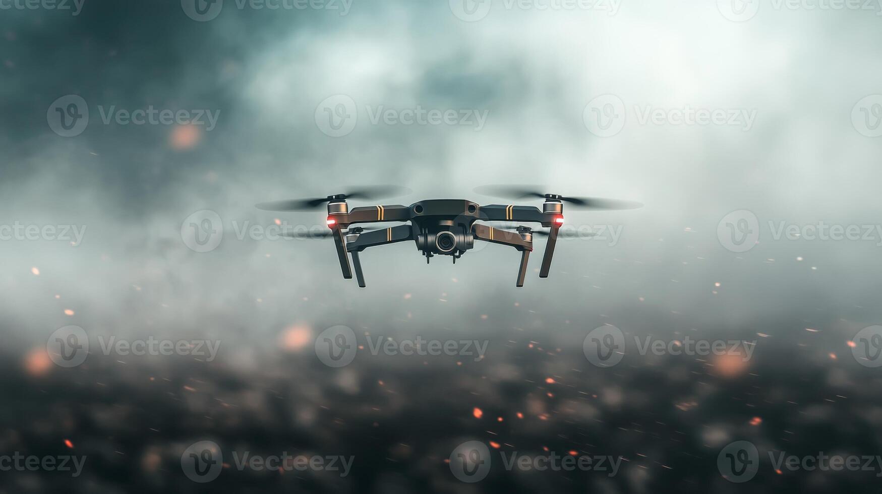 A drone hovers in a misty environment, navigating through obscured visibility while capturing aerial perspectives of the landscape. Pro Photo