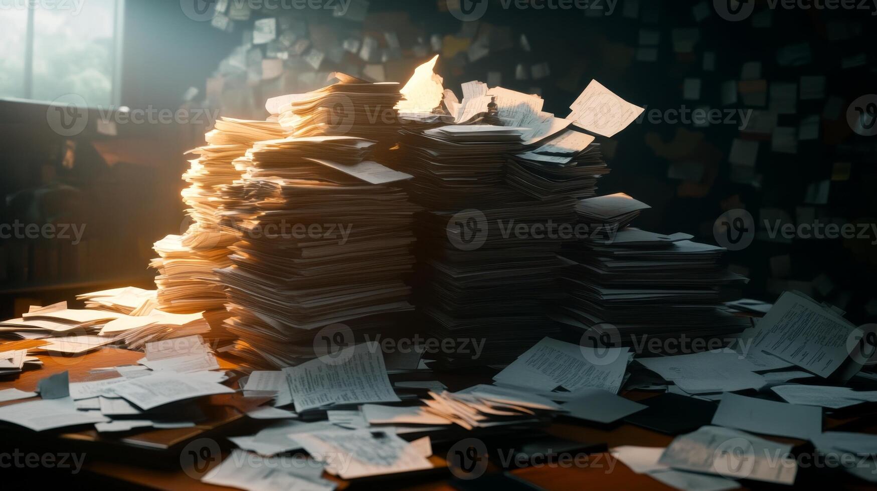 Overwhelming clutter of documents on a desk in a dimly lit room filled with paper notes and reminders Pro Photo