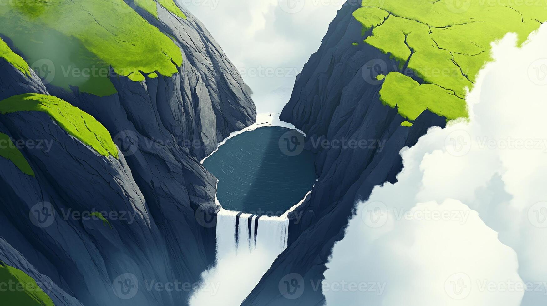 Majestic waterfall cascading into serene pool within rocky cliffs under cloudy sky Pro Photo