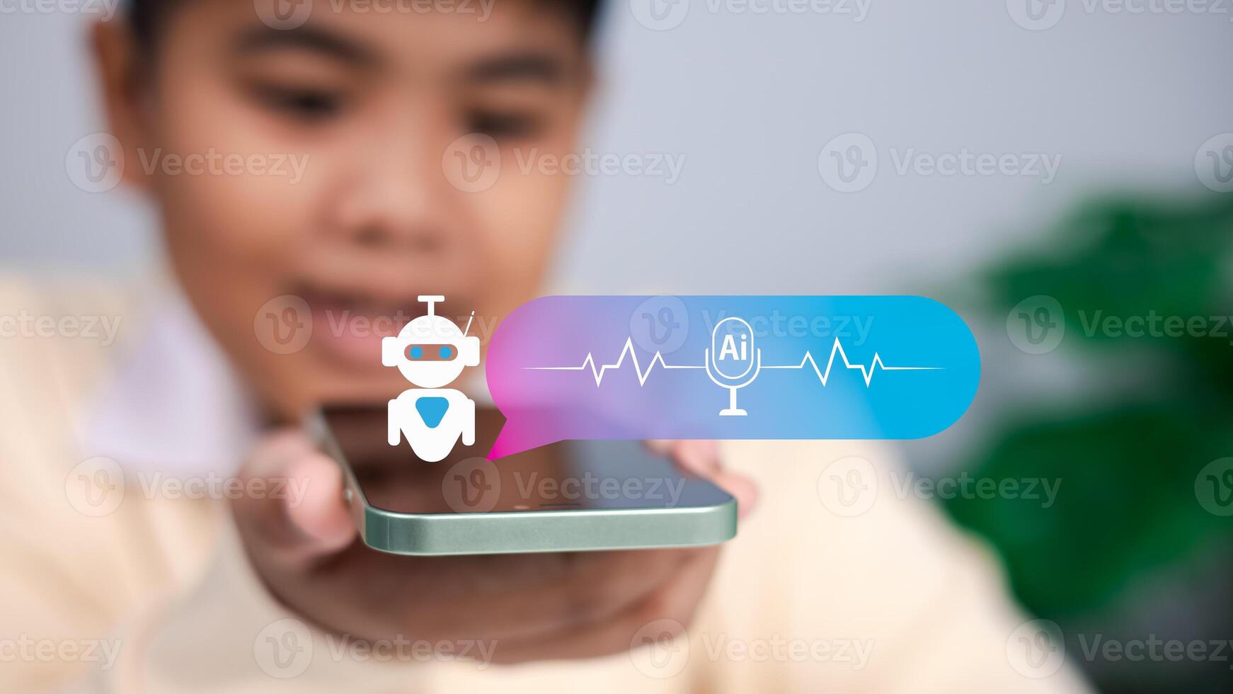 Young person using smartphone with AI assistant chatbot and voice wave icon representing artificial intelligence and digital innovation Pro Photo