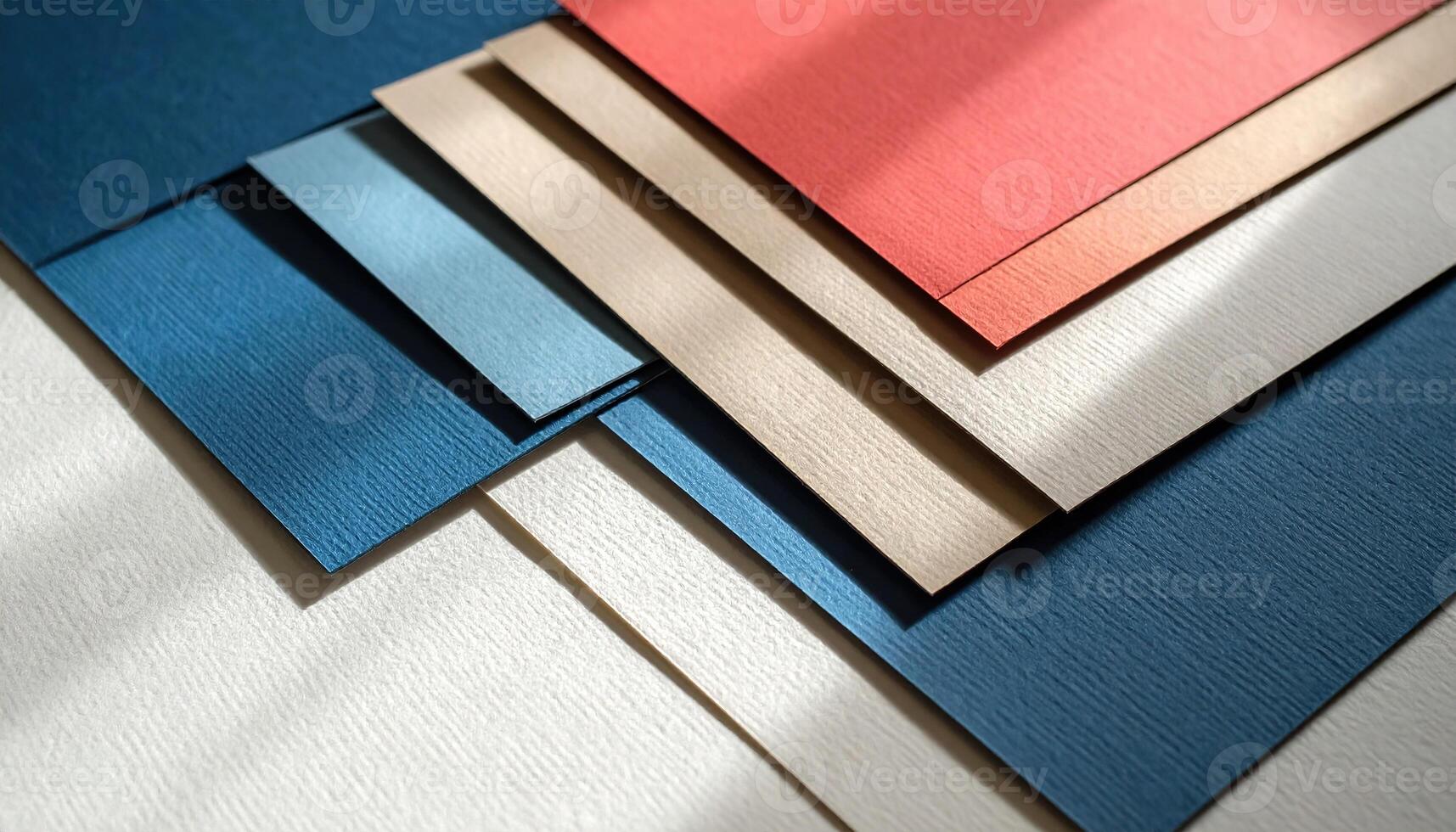 A collection of textured papers in various shades of blue, red, beige, and white, arranged in an overlapping pattern, showcasing a range of hues and subtle surface details. Pro Photo