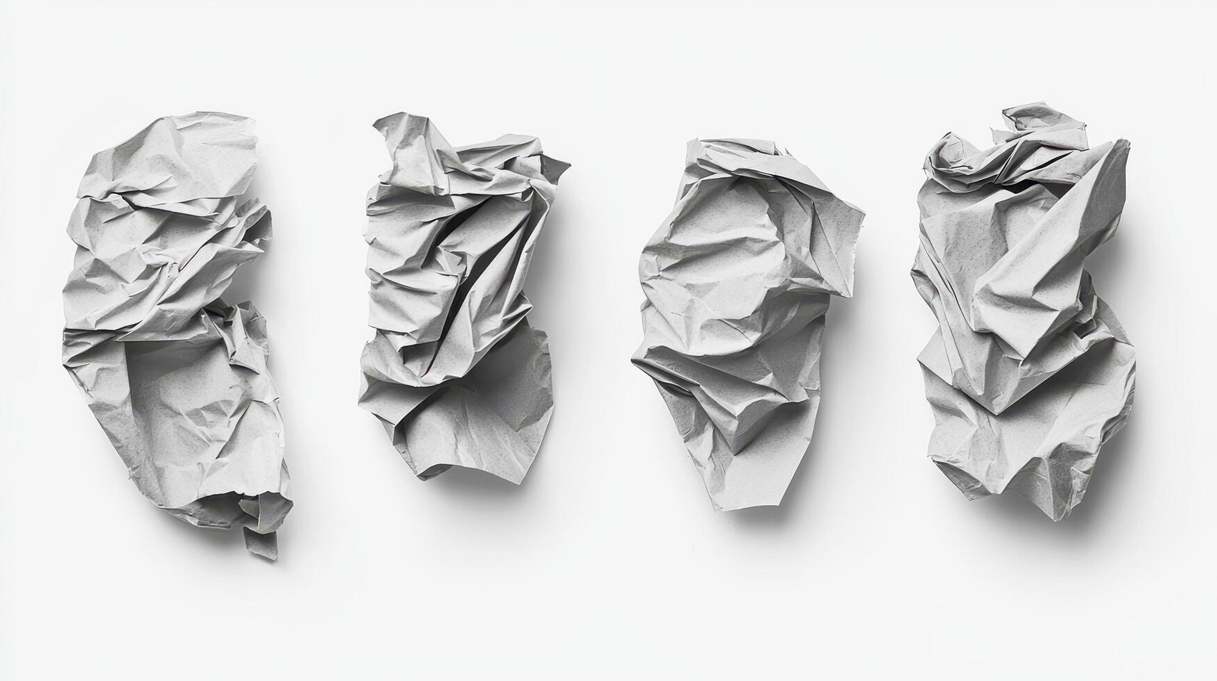 Crumpled gray paper textures arranged in various shapes, creating abstract visual. unique forms evoke creativity and artistic expression Free Photo