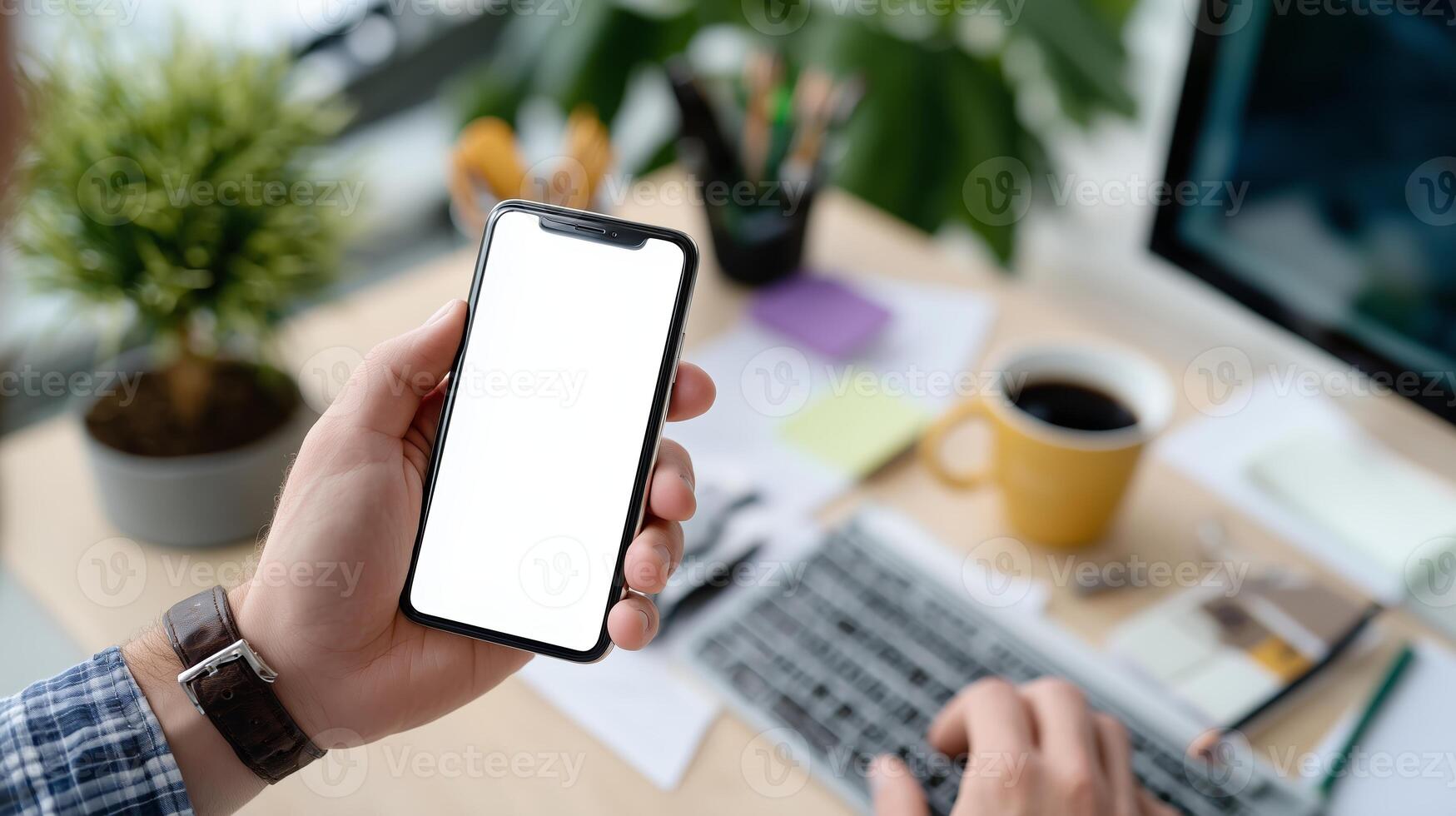 Person holding a smartphone while working at a desk with a computer and coffee in a modern office setting Pro Photo