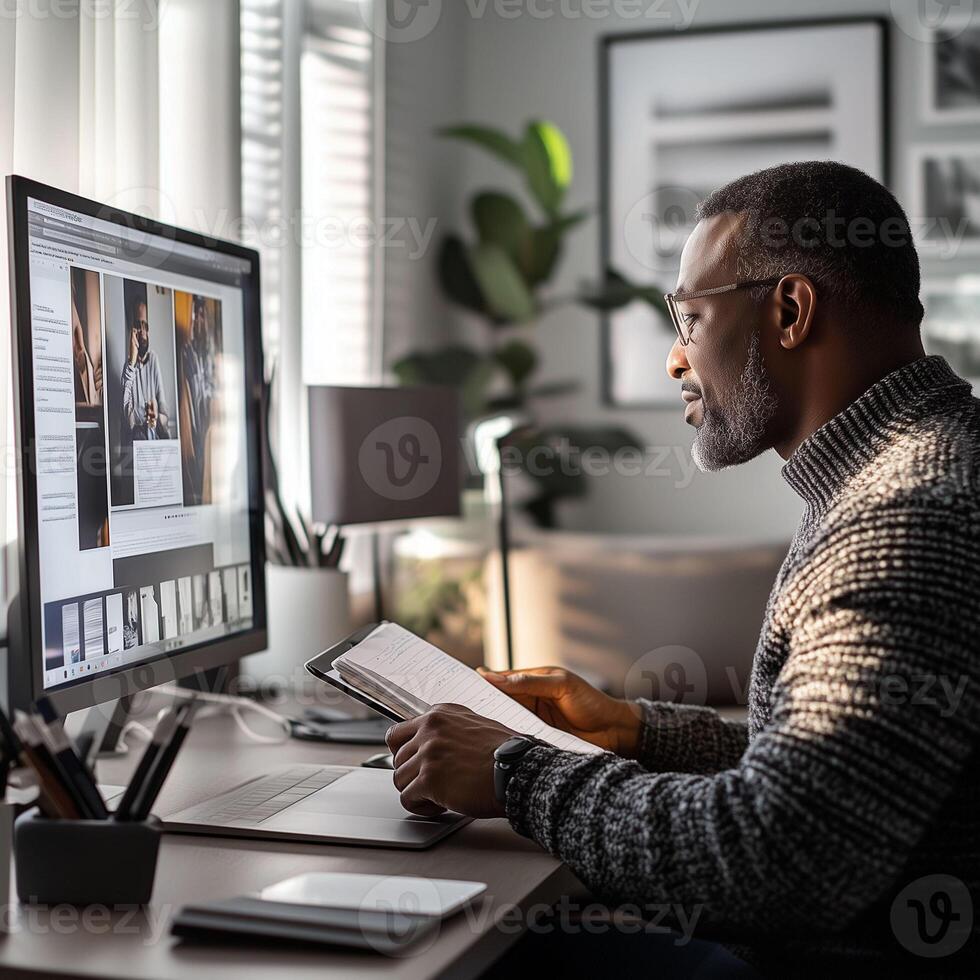 Man reading in a cozy workspace during the day while using a computer Pro Photo