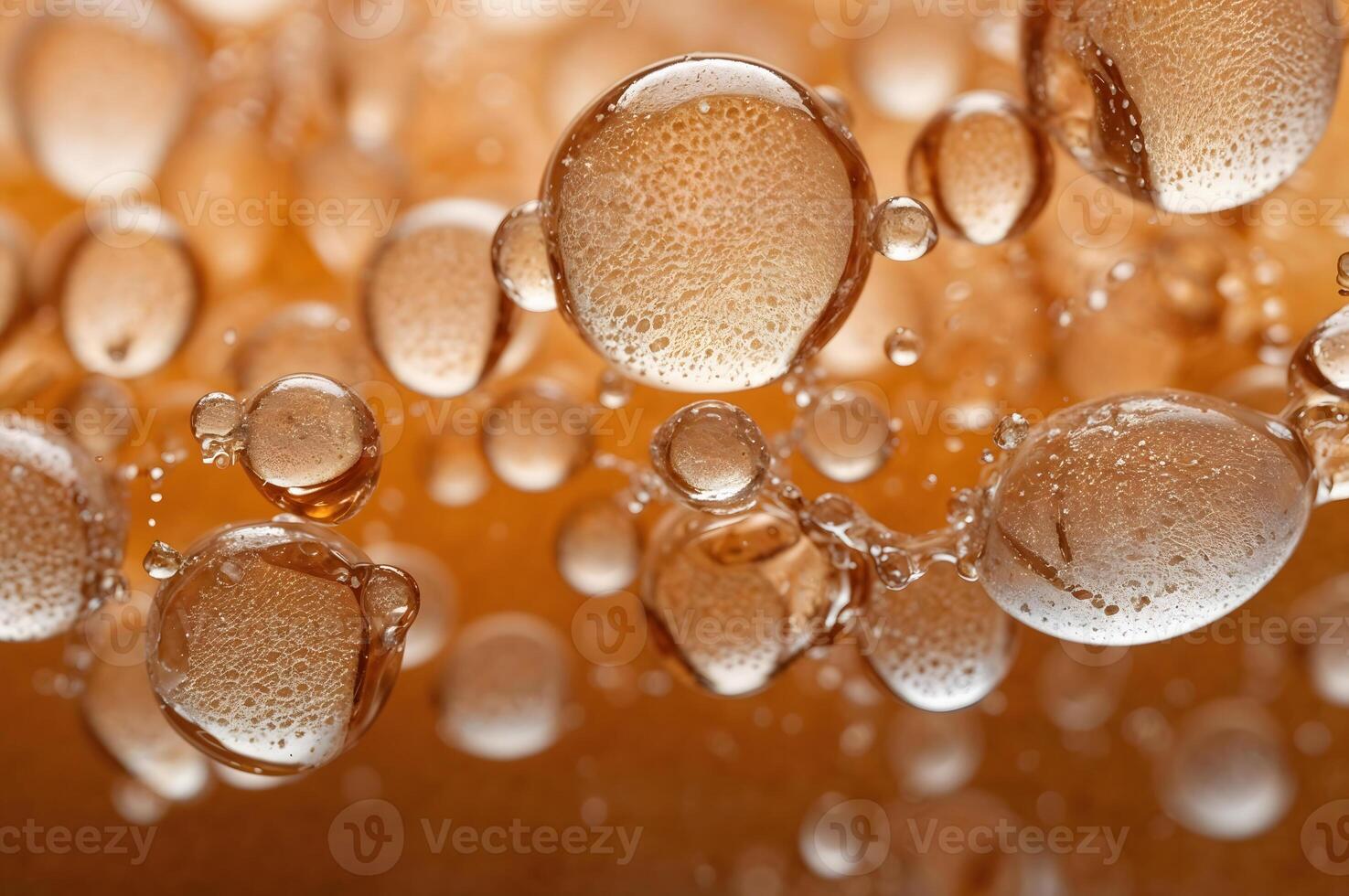 Abstract macro view of golden liquid bubbles and droplets creating a textured, dynamic fluid surface. Pro Photo
