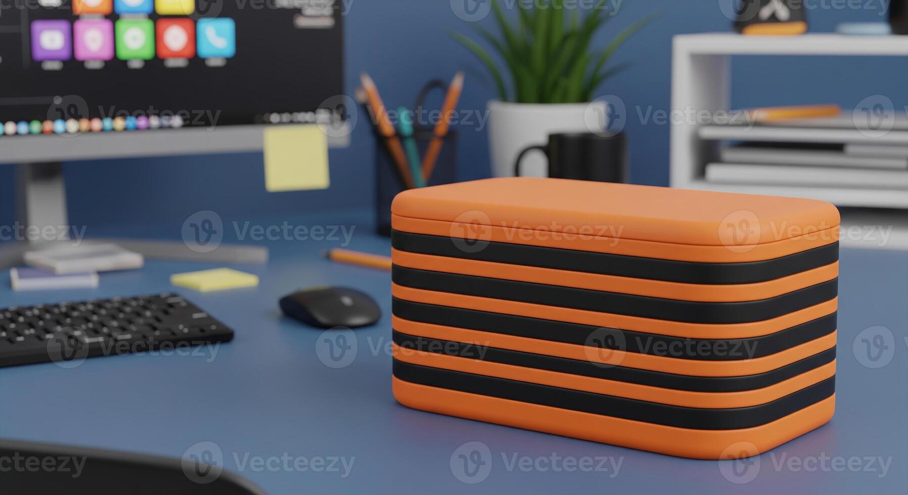 Closeup of a modern desk setup with a computer, keyboard, mouse, and various office supplies in a contemporary workspace Pro Photo