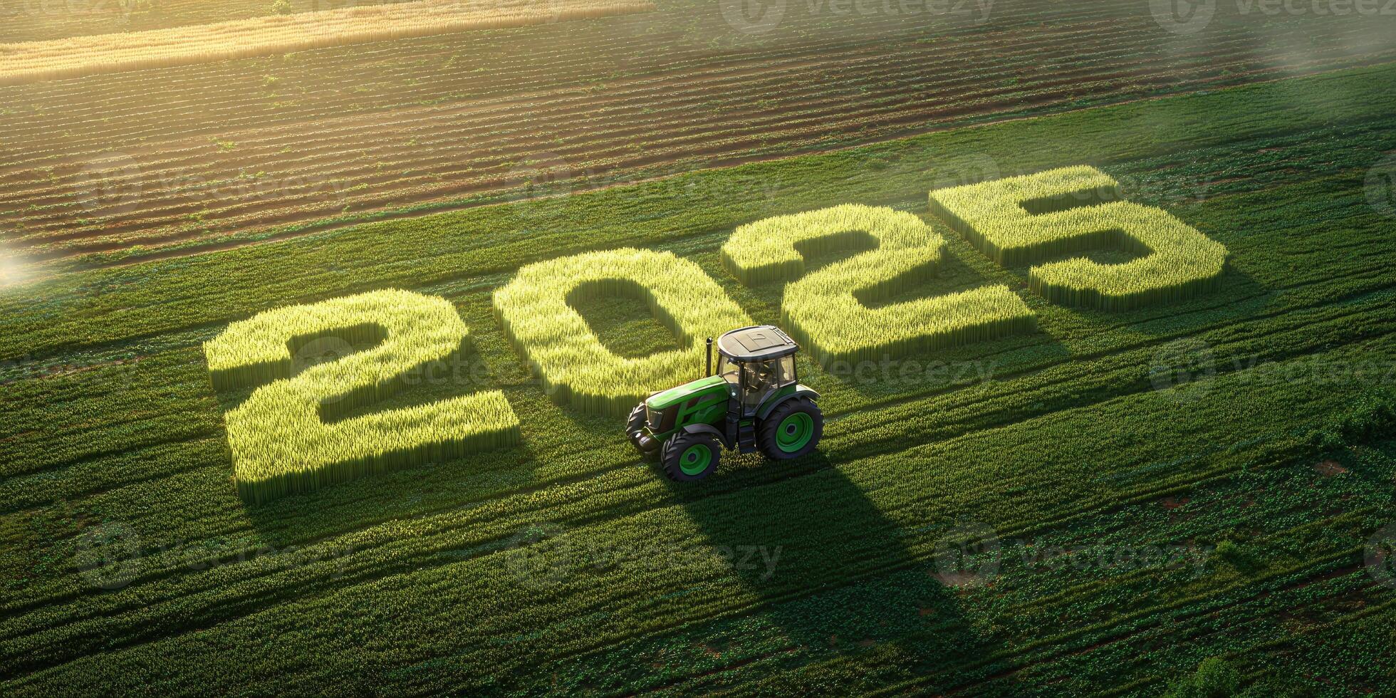 Aerial view of a field with the year 2025 depicted in the grass. A tractor is visible in the center Pro Photo