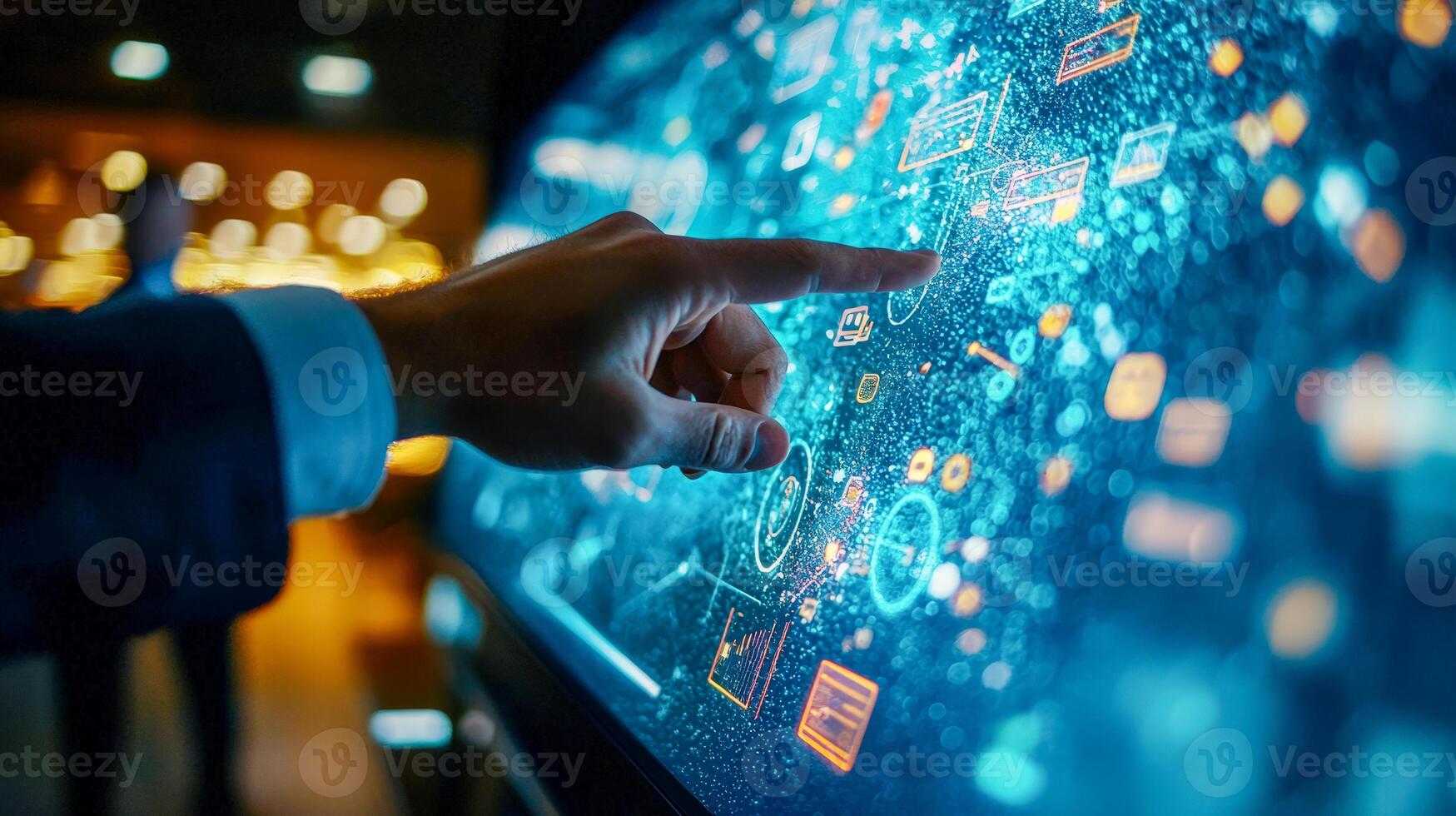 Person interacting with a digital touchscreen interface displaying data and icons in a high-tech environment Pro Photo