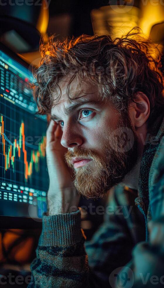 Man analyzing financial data on a computer screen with stock market graphs during nighttime Pro Photo