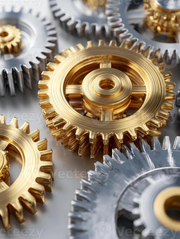 Close-up view of interlocking metallic gears in gold and silver, symbolizing intricate machinery, engineering precision, and innovative mechanical systems Pro Photo