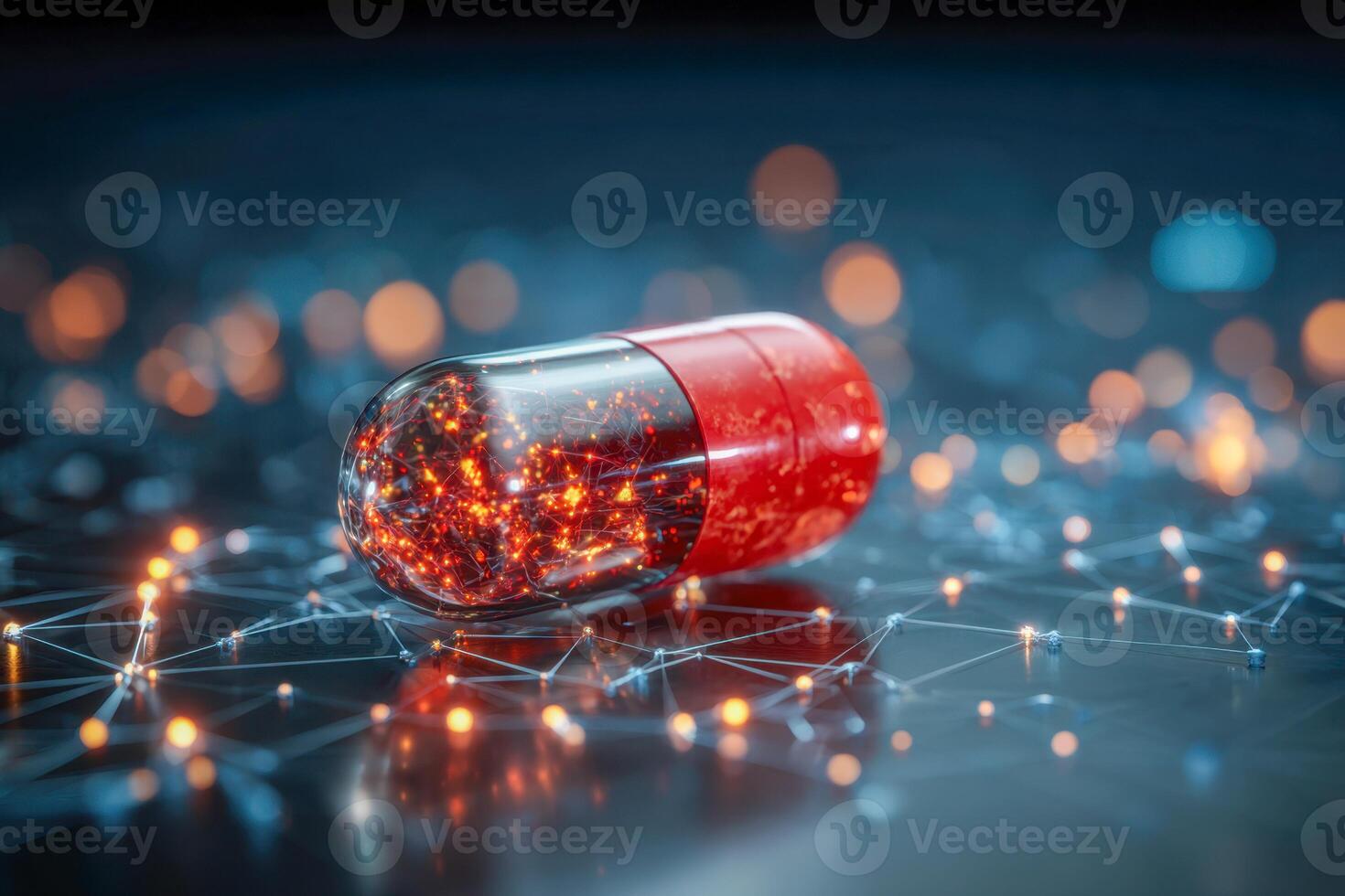 Red capsule with glowing interconnected particles representing advanced technology innovation and futuristic concepts in medicine and digital networks Pro Photo