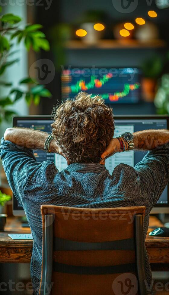Man analyzing stock market data on dual computer screens with trading charts in the background Pro Photo