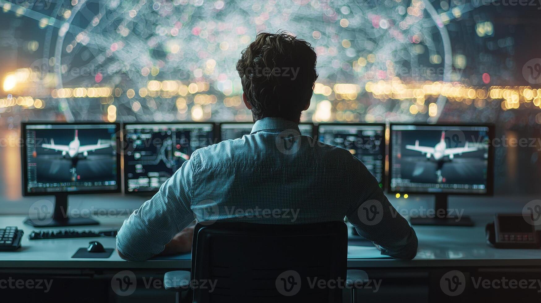 Air traffic controller working at night with multiple monitors and a city skyline in the background Pro Photo