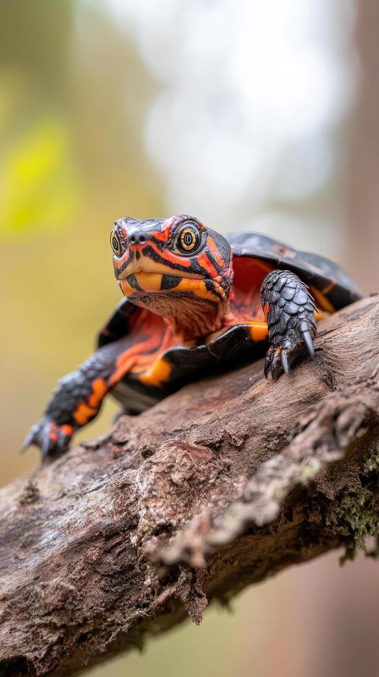 Painted turtle resting on tree branch showing vibrant color patterns photo