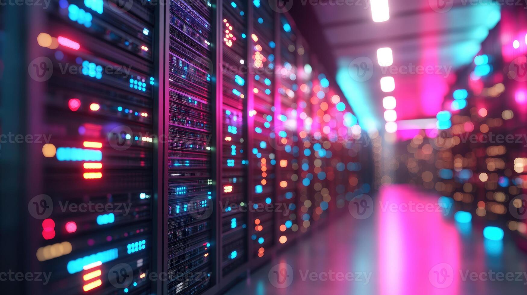 Server racks in data center with glowing lights for it infrastructure and data storage Pro Photo