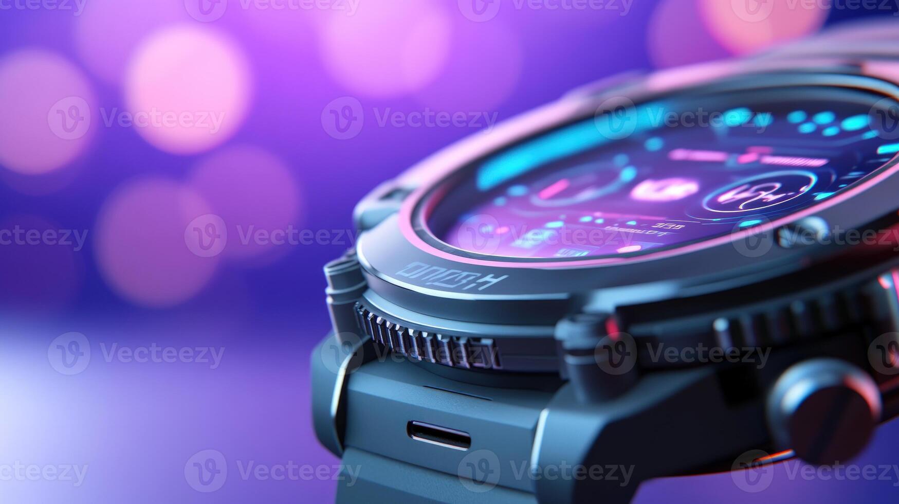 Sleek smartwatch device showing interface in a detailed close up against abstract background Pro Photo