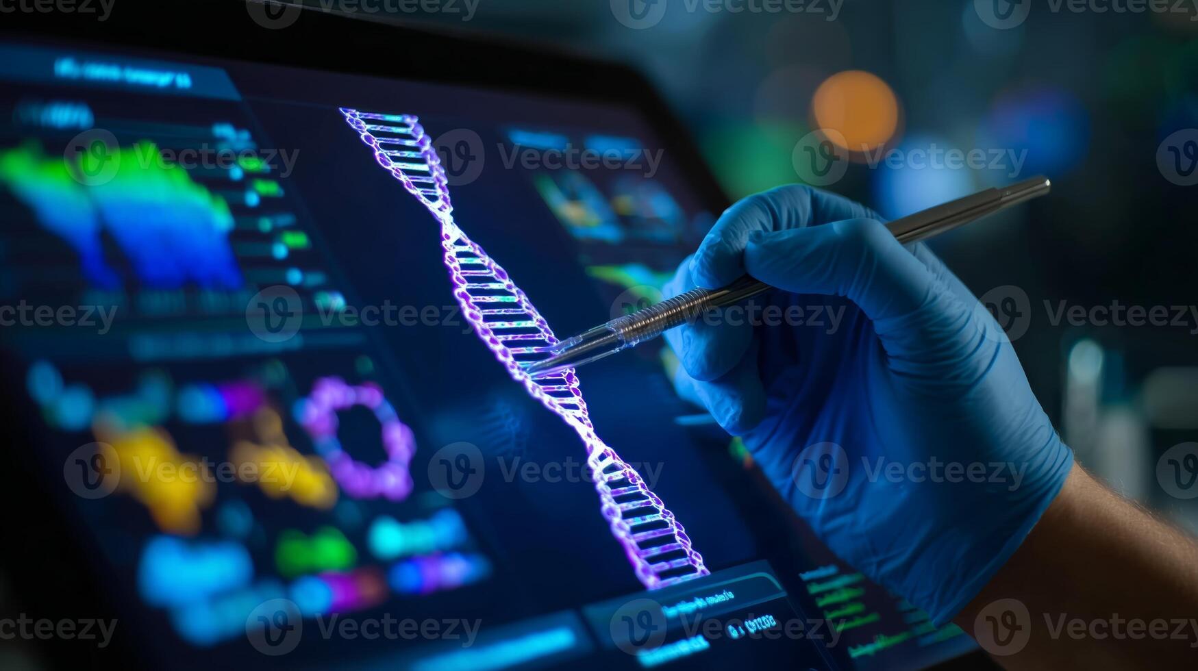 Researcher analyzes DNA sequence data on a digital interface in a laboratory setting during evening hours Pro Photo