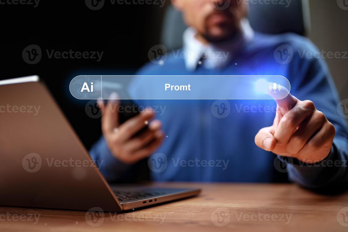 Individual engages with artificial intelligence interface while using a laptop and smartphone in a modern workspace Pro Photo
