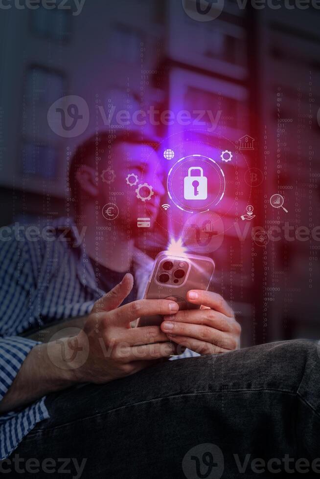 Exploring mobile security features in digital technology while sitting outdoors in an urban setting Pro Photo