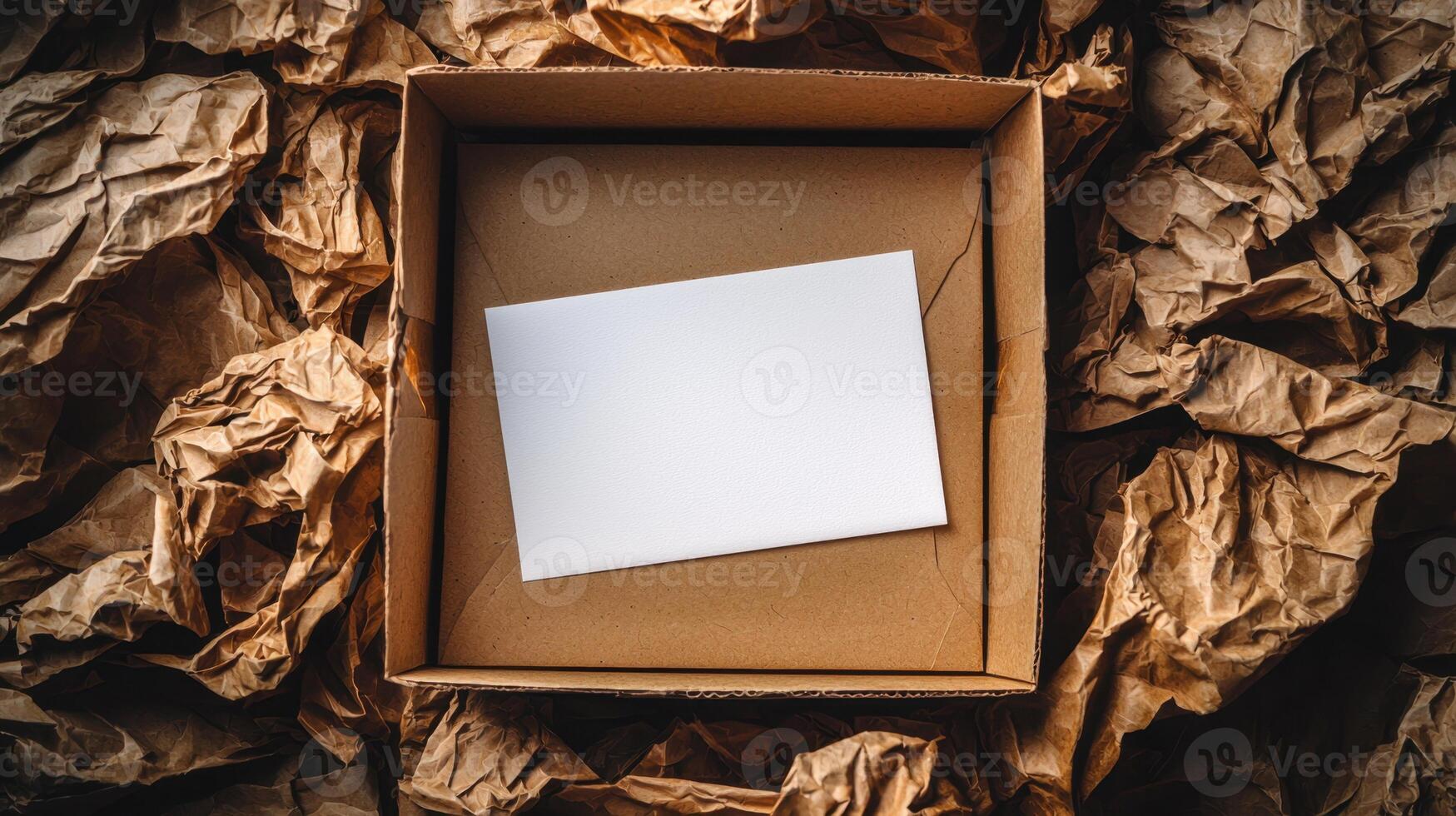 An empty cardboard box with a blank white card inside, surrounded by crumpled brown paper on a rustic background Pro Photo