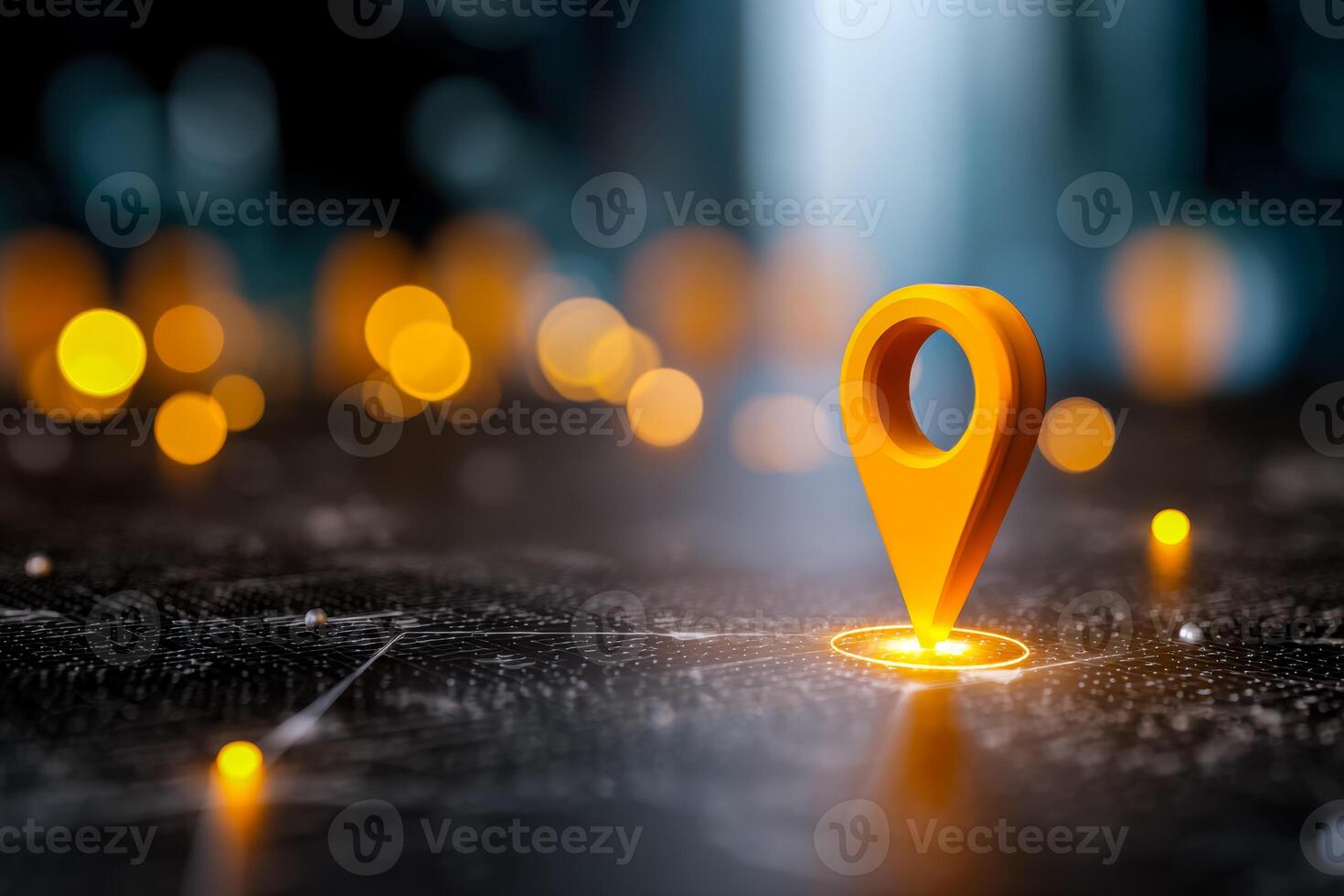 Digital map pin icon illuminated on a futuristic interface with glowing background lights Pro Photo