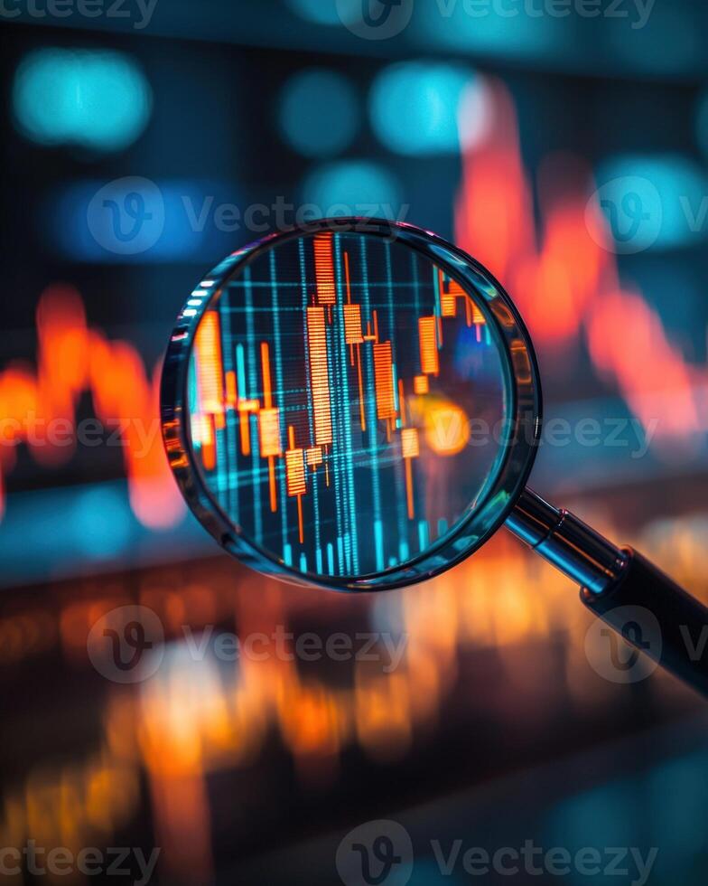 Close-up of a magnifying glass analyzing stock market data and financial graphs on a monitor Pro Photo