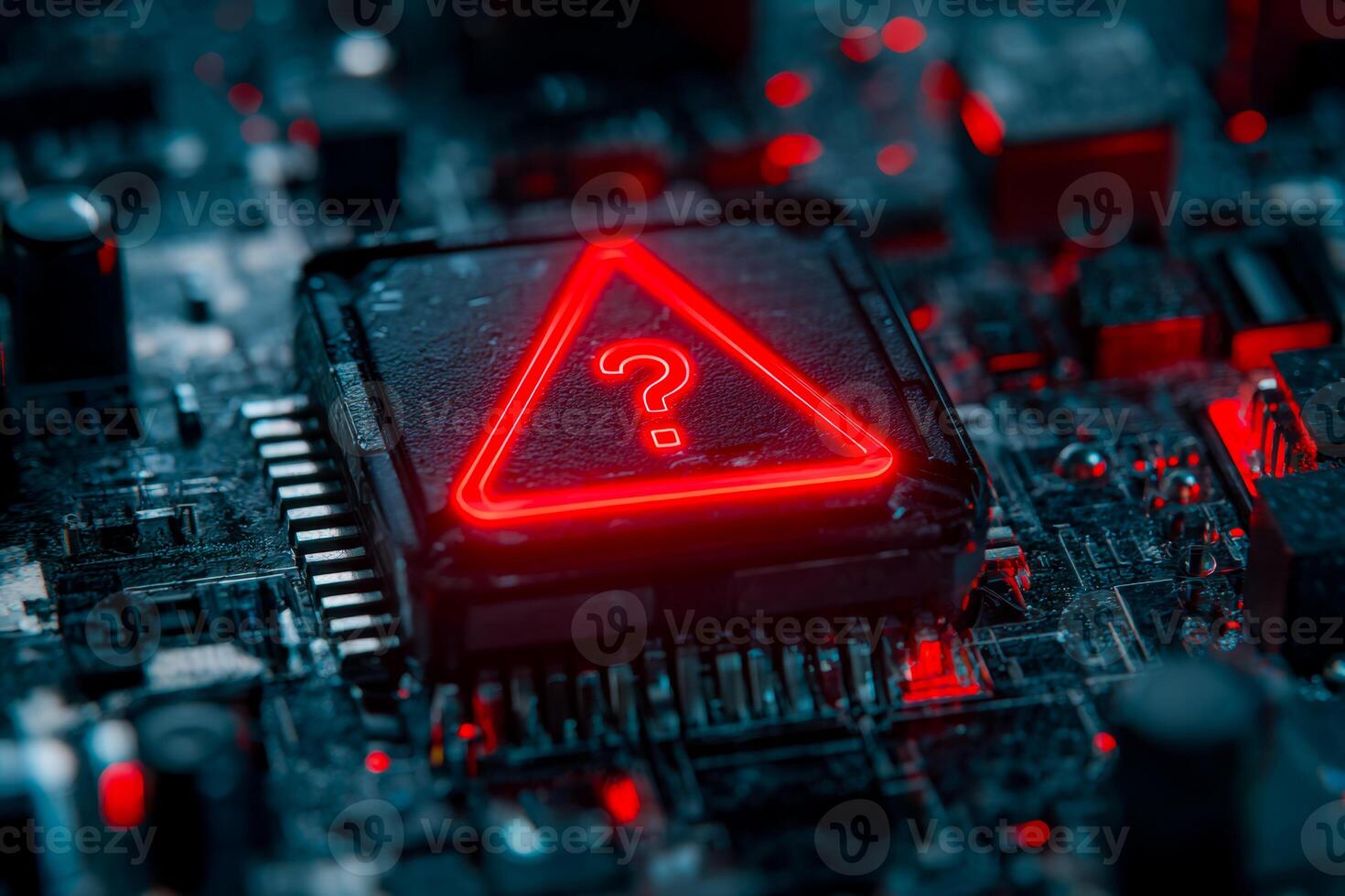 Illuminated warning symbol with question mark on a computer chip in a dark electronic circuit. Pro Photo