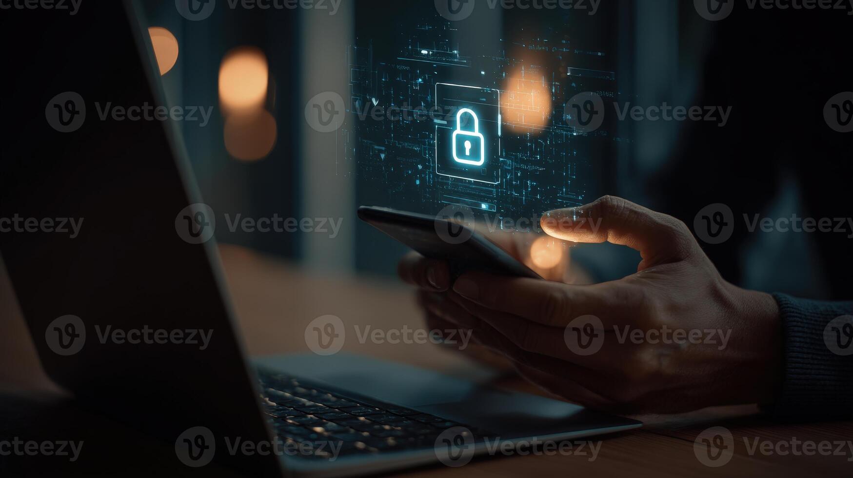 Person using a smartphone with digital lock security icon and a laptop in a dark environment Pro Photo
